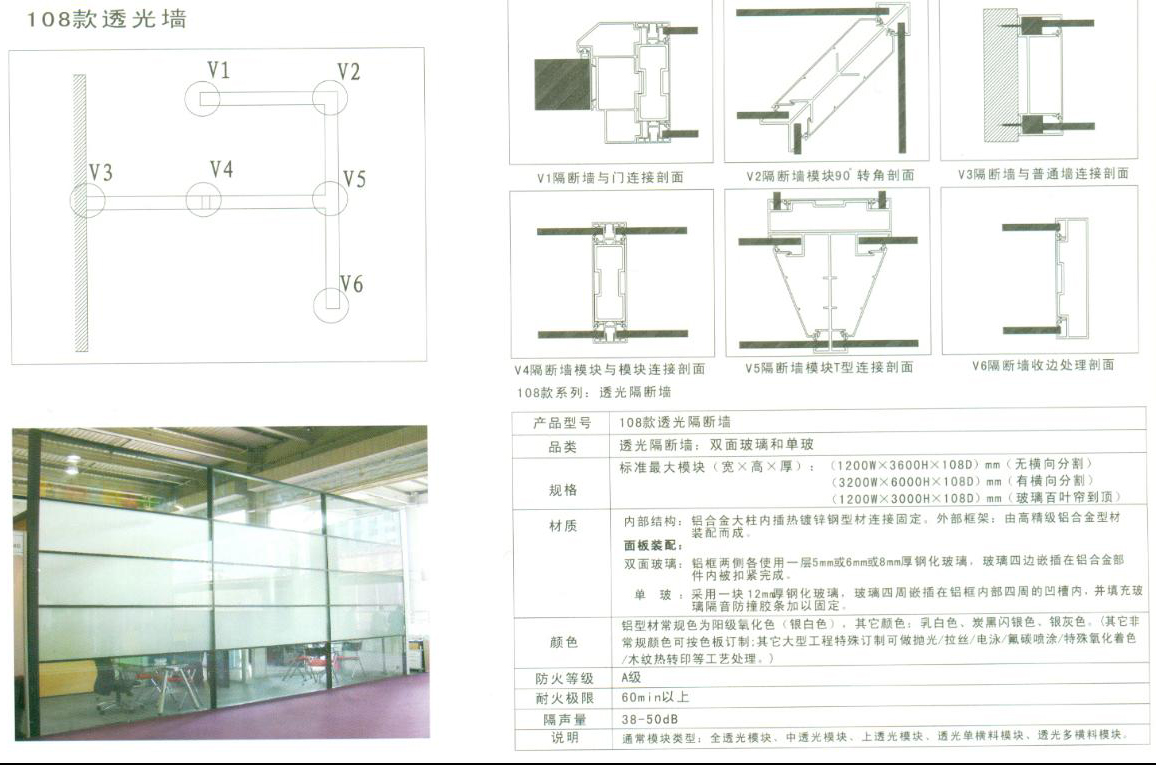 108款高隔断,厚度为108mm,它又分为108款双玻隔断和108款双面隔断,是目前东方华奥家具主推产品。面板跨度最大可达2400mm,玻璃跨度最大可达3200mm,高度可以做到6000mm,是东方华奥家具隔断墙系列里跨度分割和高度分割最大的一个系列。