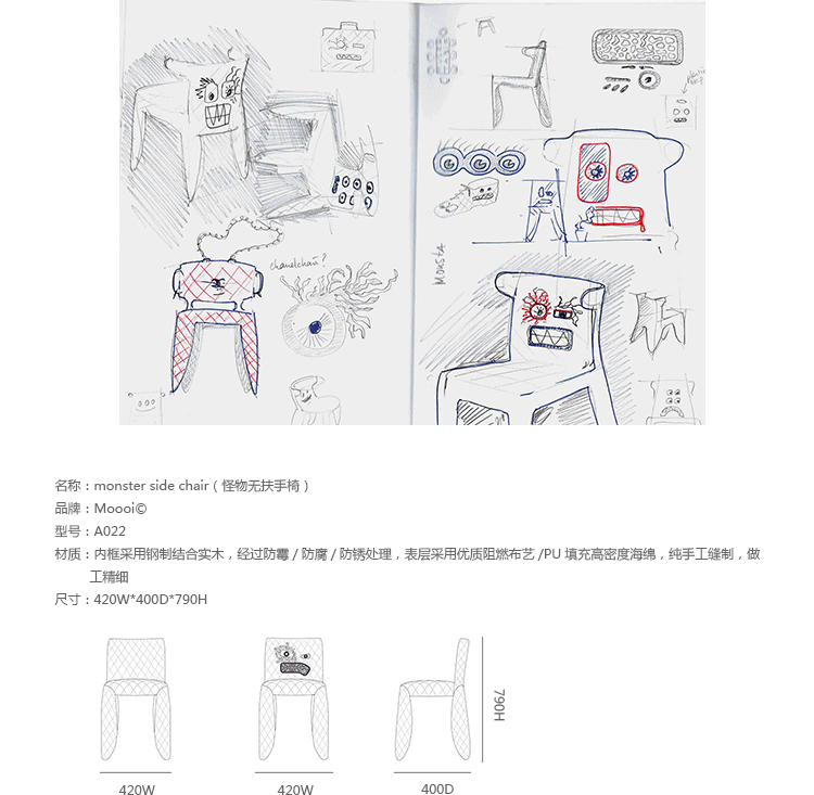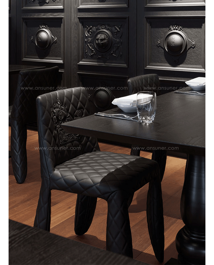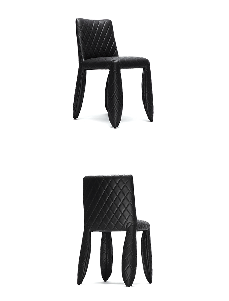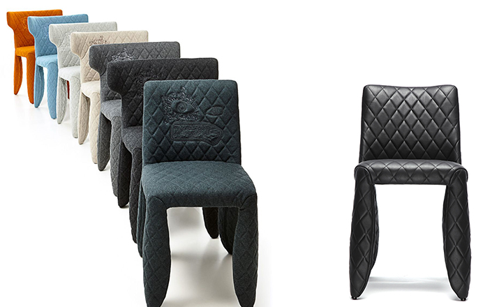 "A soft, puffy and stylish chair with an optional monster face embroidered on the backrest.The monster is a symbol of the eternal battle between opposite forces that take place in life and can be easily recognized inside ourselves,if we have the courage to open our eyes.Scary? Not at all! You forget about the monster once you sit down and enjoy the chair's comfort and softness.Marcel Wanders grew up in Boxtel, the Netherlands and graduated cum laude from the School of the Arts Arnhem in 1988.His fame started with the iconic Knotted Chair in 1996.He is now designing for the biggest European contemporary design manufacturers including Moooi of which he is also art director and co-owner.He works on architectural,interior design and consumer home appliances.His designs have been selected for the most important design collections and exhibitions around the world.Monster chair is offered with a synthetic leather upholstery in black.The chairs can be ordered with or without monster face and with or without armrests.The monster embroidery is identical in both versions."