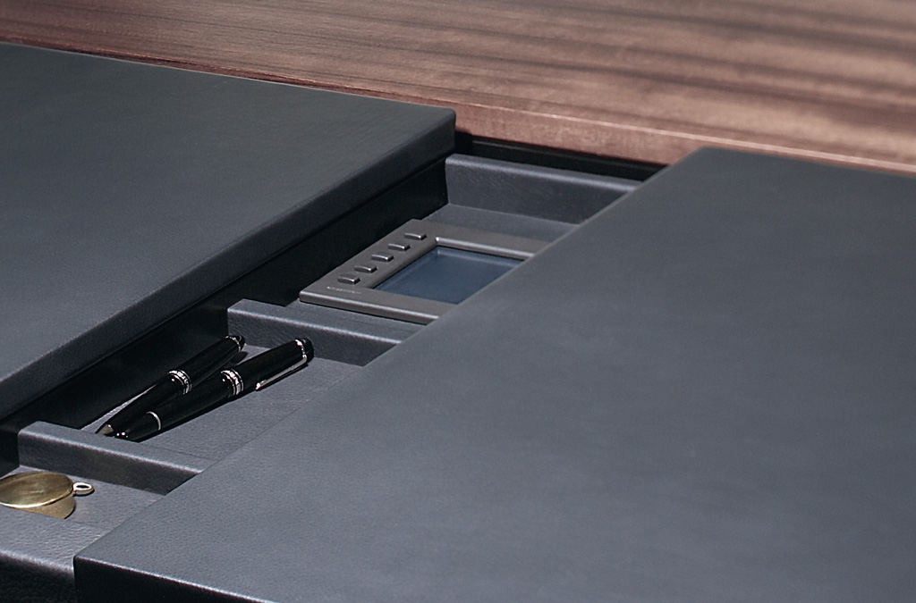 这是EOOS的新总部和会议项目设计团队对该产品强大的美学诉求,比例和维度在优雅的材料的相互作用下给人深刻的印象。在几何基础上,材料的拼贴形成了它的气场。海洋胡桃木饰面可以给你和你的客人带来一种很好的体验;扶手处采用精美的皮革覆盖。由Corian制成的白色方块盖住了集成线盒,看不见的触点是打开的关键。每个设备的连接器都在方块之下,所有的电缆都隐藏在侧板和桌子上,衔接到各种设备。在工作台表面的旁边,一个隐藏的抽屉,里面可以收纳你日常所需的小物件。