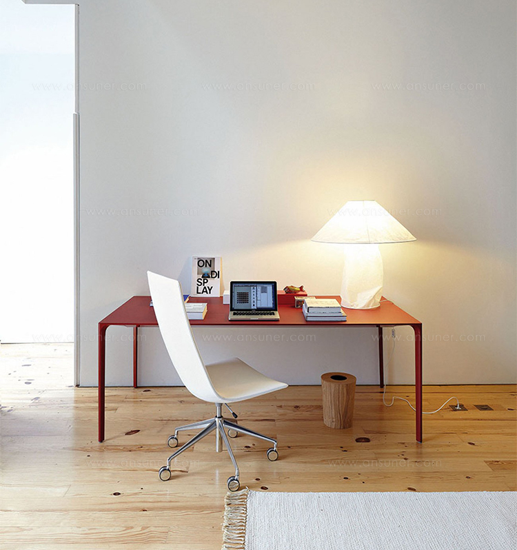 Nuur有方形或矩形两种形式,层压顶部有多种颜色可供选择,也可采用木饰面板制成。 高度可调节的结构采用抛光或涂漆铝制。