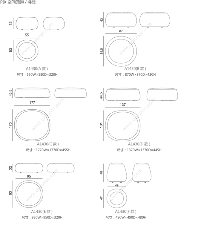 Pix 空间圆蹲/矮凳 系列尺寸/示意图