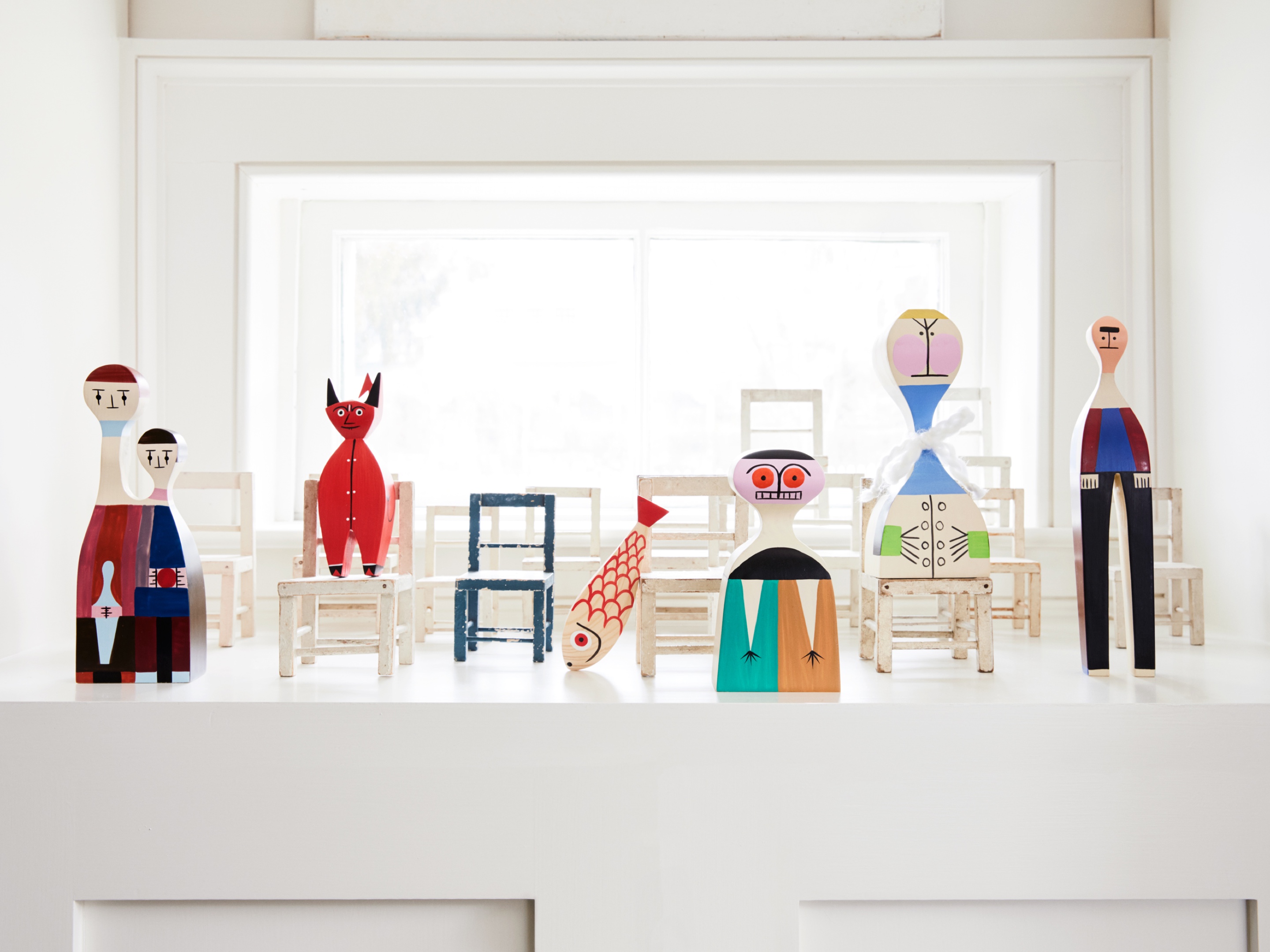 两条鱼 - 一位母亲和她的小母狗 - 将动物世界的另一个主题添加到亚历山大吉拉德的木制娃娃的欢乐家庭中。 它们的水平方向使它们与大型娃娃系列中其他人物的站姿相区别。