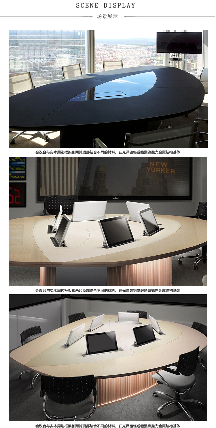 会议桌。有机杏仁形顶部。顶部分为两个区域:中心和周边,允许不同材料和饰面的组合。50mm厚的顶部由两部分组成:盖子和45o斜面底盖。办公桌专门设计用于集成可伸缩电脑显示器,电缆管理和电子系统的其他部分。底座由隐藏的金属结构组成,封闭有可拆卸的面板,可以方便地进入桌子内部,以便进行电缆管理和维护。表面处理:混合成品顶部采用木材,微纹理漆或Techno Leather软垫。以漆面为基础。