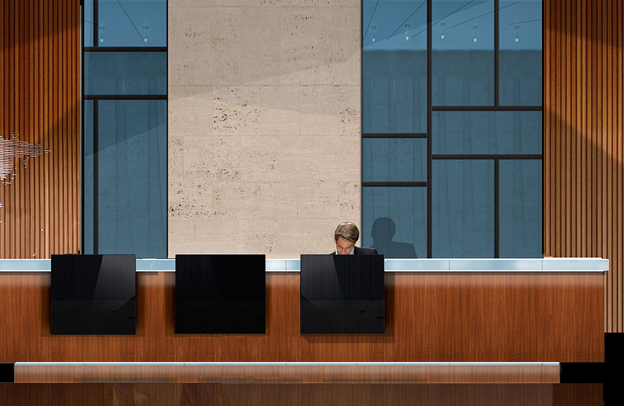 前台。高架的前板提供工作区域的亲密度和75厘米高度的桌子,用于通信和接近访客。表面处理:前板,天然木饰面。桌面,结合了Tech-Leather和微纹理漆面。下前板,微纹理漆面。咨询其他尺寸或形状。