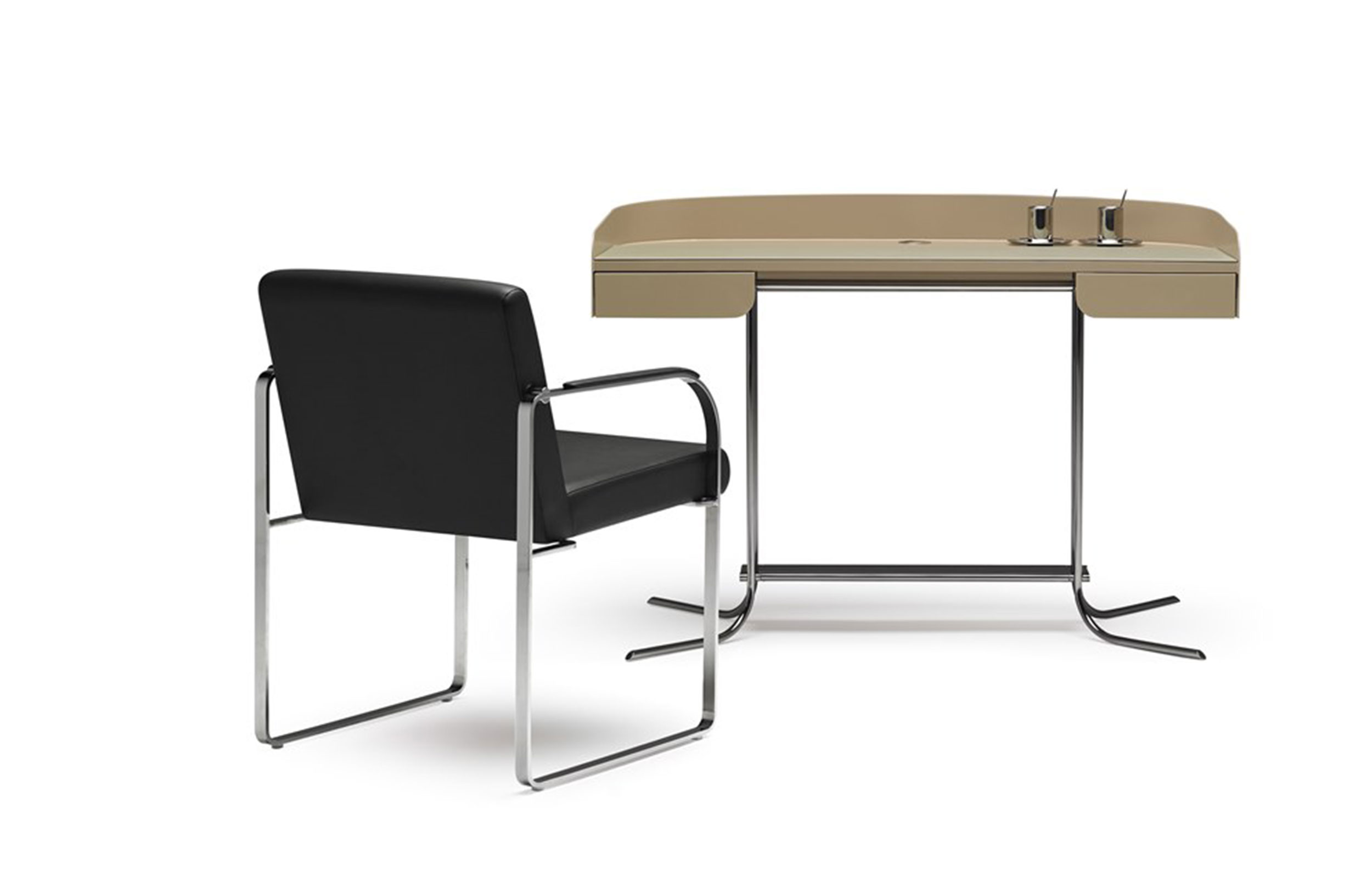 多用途桌子。漆面,背面和侧板有凸起的屏幕。工作区域有软垫表面。桌子两侧配有2个铅笔托盘,中央区域清晰。圆柱形实心挤压金属框架和结构杆结合了实木和金属。