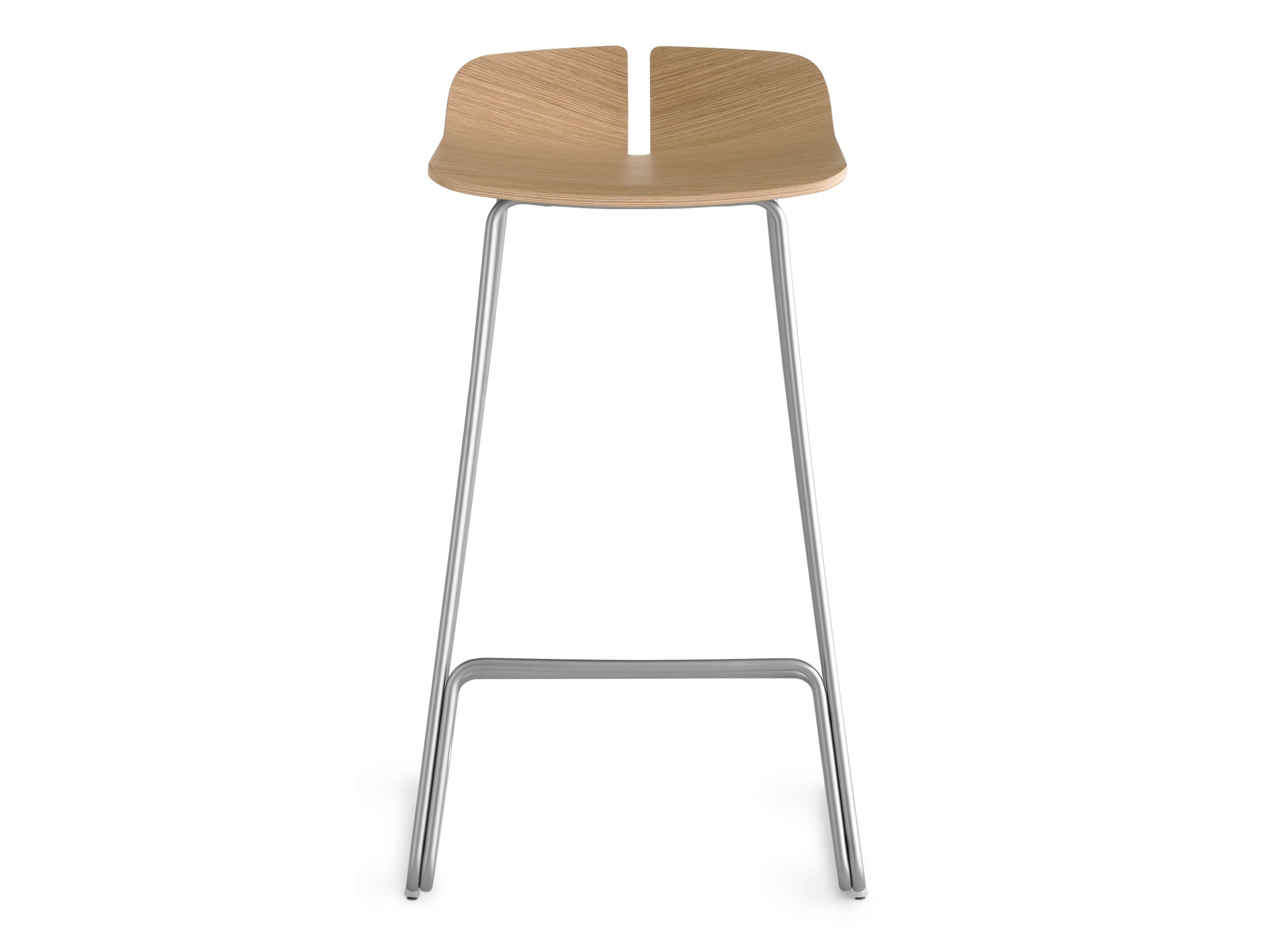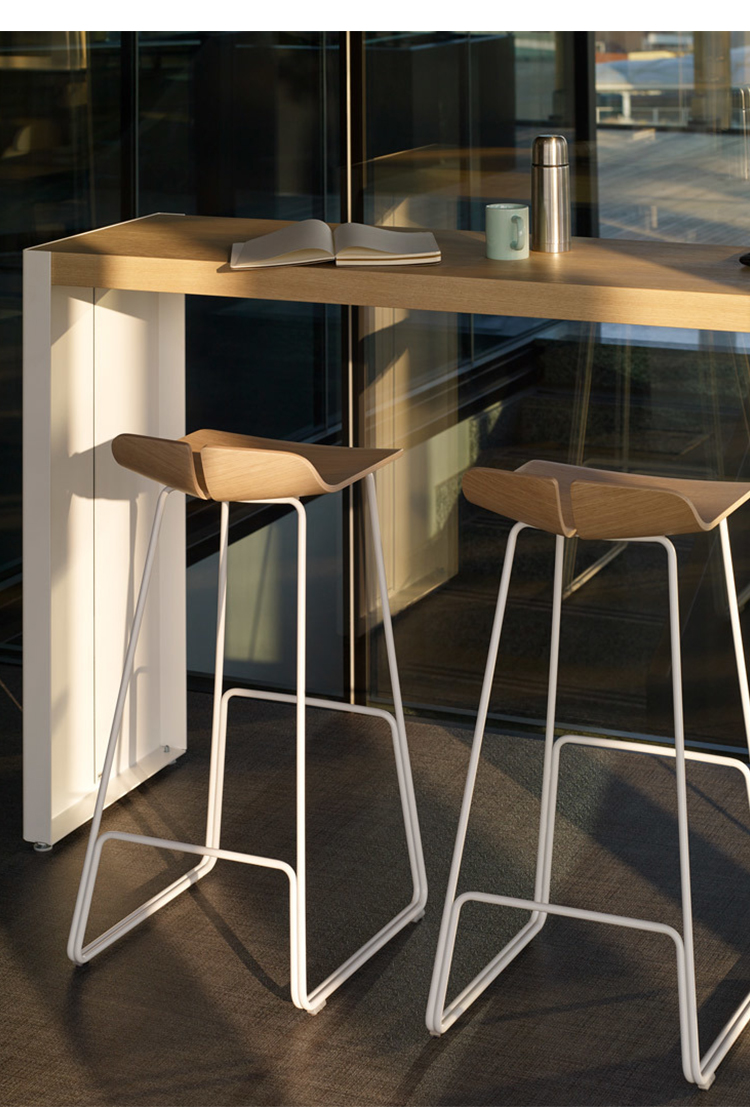一个很小的间隙,一条线的中断,和连接的凳子形状。它是轻的,就像它狭窄的金属底座和木质座椅所暗示的那样,轻轻弯曲形成靠背。在自然的木材版本,纹理加强了柔软的轮廓和拥抱像一个非常新鲜的叶子,突出其结构的轻盈性。