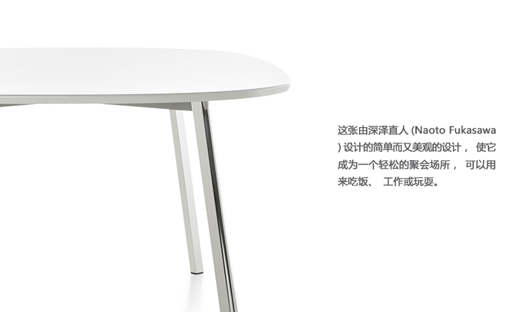 这张由深泽直人(Naoto Fukasawa)设计的简单而又美观的设计,使它成为一个轻松的聚会场所,可以用来吃饭、工作或玩耍。无论是方形还是椭圆形,多功能的表面都能改善任何环境——自然地与Fukasawa的Deja-vu椅子很相配。