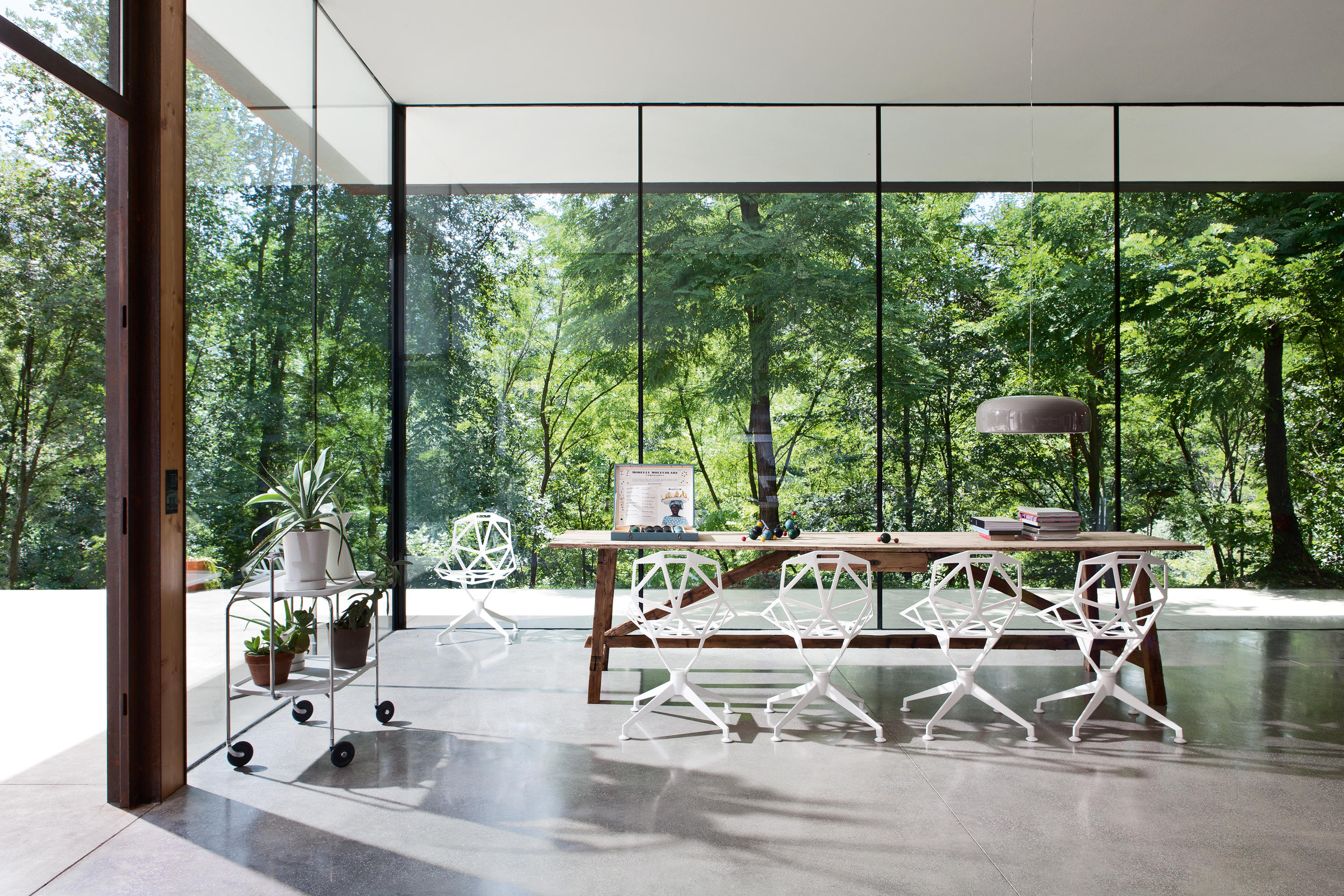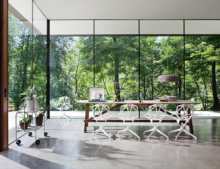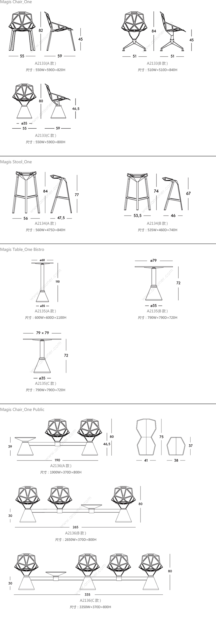 最受瞩目的德国设计师Konstantin Grcic 应邀为MAGIS 设计的Chair One(几何吧椅),是设计生涯中最具有标志的产品之一。办公椅体为模铸铝合金结构,经过氟化钛镀膜与塑料粉末涂布。椅子具有阻燃性、抗腐蚀性。适合室内及室外使用。以铝金属与钛金属制成的 Chair One,以多个平面以不同角度组合而成,建立起立体的外型。多个中空的三角型组合而成的座椅,不但令为用家带来强而有力的承托结构,而且还能在简单设计之中带出不一样的风格。这把椅子的惊人形象难免使人对它的舒适度产生疑问,但当你真正坐于其上,你会发现它实际上非常舒适,那些稀疏的网状结构能够极好地支撑不同体型的人体,后背上的把手也非常实用。当你知道Chair-One最初是被当作户外用椅而设计的,你会更加佩服Konstantin Grcic的缜密用心:极少的表面可以杜绝雨水,并且减少灰尘堆积,夸张的形态则令它能够在街道、建筑或自然的环境中拥有自己美学上的存在,而不是被环境所吞没。Konstantin Grcic花了三年时间设计Chair One,自2003年诞生以来,堪称Grcic精简主义风格的代表作。2006年,Chiar One为Konstantin Grcic赢得了德国政府的设计大奖。