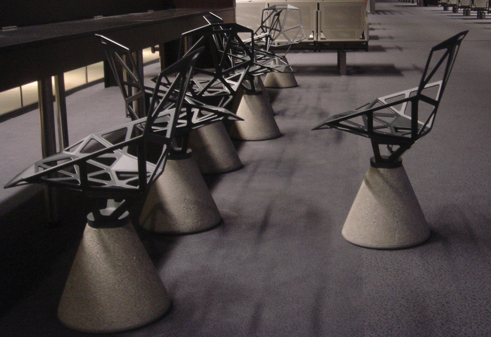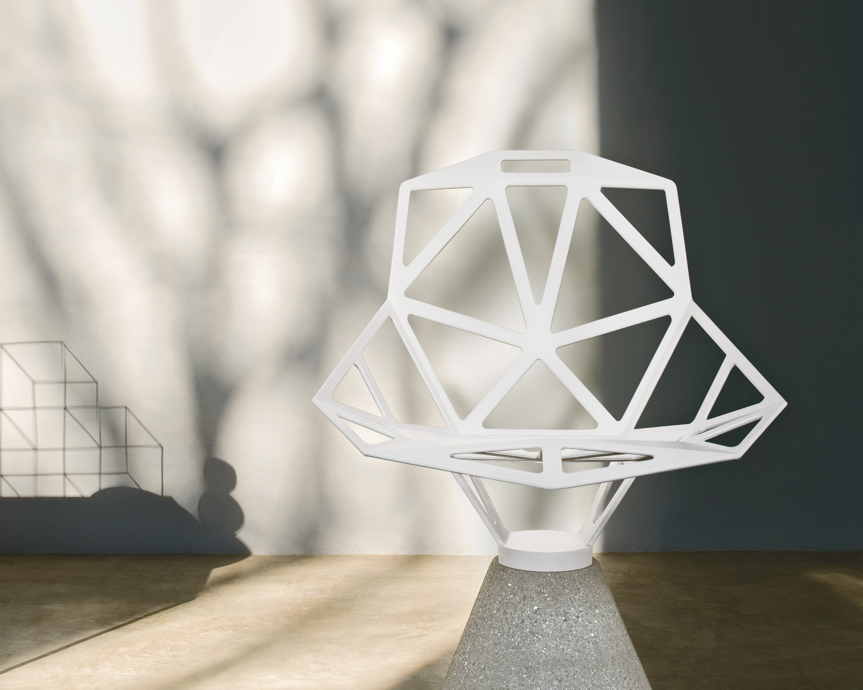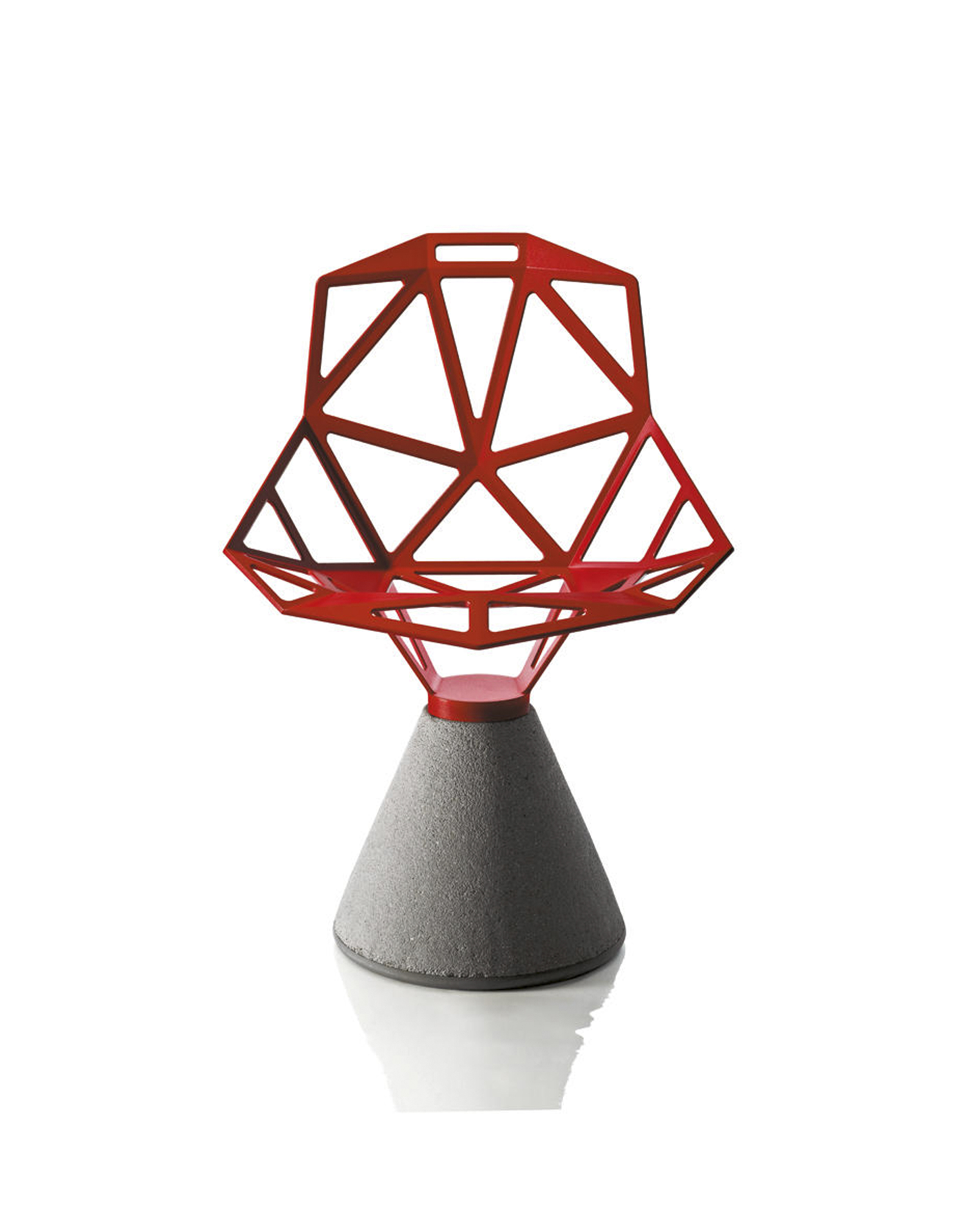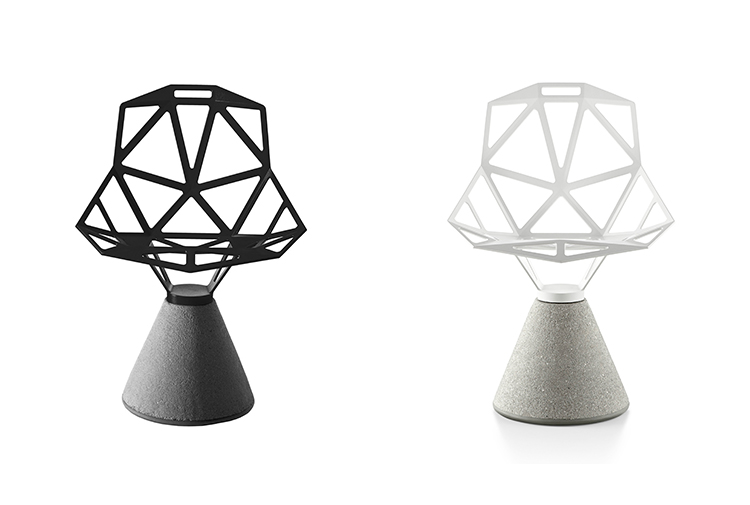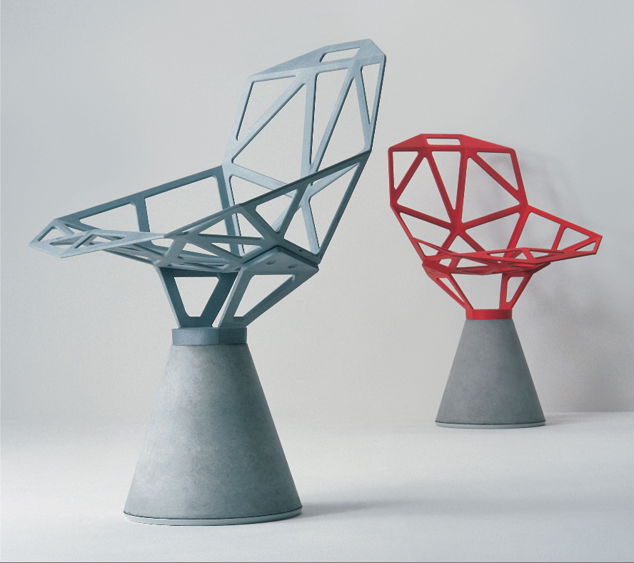 最受瞩目的德国设计师Konstantin Grcic 应邀为MAGIS 设计的Chair One(几何吧椅),是设计生涯中最具有标志的产品之一。办公椅体为模铸铝合金结构,经过氟化钛镀膜与塑料粉末涂布。椅子具有阻燃性、抗腐蚀性。适合室内及室外使用。以铝金属与钛金属制成的 Chair One,以多个平面以不同角度组合而成,建立起立体的外型。多个中空的三角型组合而成的座椅,不但令为用家带来强而有力的承托结构,而且还能在简单设计之中带出不一样的风格。这把椅子的惊人形象难免使人对它的舒适度产生疑问,但当你真正坐于其上,你会发现它实际上非常舒适,那些稀疏的网状结构能够极好地支撑不同体型的人体,后背上的把手也非常实用。当你知道Chair-One最初是被当作户外用椅而设计的,你会更加佩服Konstantin Grcic的缜密用心:极少的表面可以杜绝雨水,并且减少灰尘堆积,夸张的形态则令它能够在街道、建筑或自然的环境中拥有自己美学上的存在,而不是被环境所吞没。Konstantin Grcic花了三年时间设计Chair One,自2003年诞生以来,堪称Grcic精简主义风格的代表作。2006年,Chiar One为Konstantin Grcic赢得了德国政府的设计大奖。