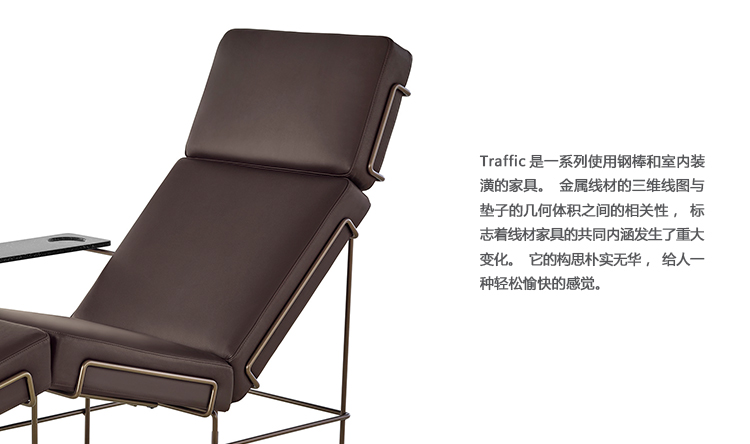 Traffic是一系列使用钢棒和室内装潢的家具。金属线材的三维线图与垫子的几何体积之间的相关性,标志着线材家具的共同内涵发生了重大变化。它的构思朴实无华,给人一种轻松愉快的感觉。精致的细节和精心设计的比例刺激了响亮的优雅。构造的内在逻辑创造了一种正式的语法,允许一些功能上的衰落形成交通集合:一张扶手椅,一张两个座位的沙发,一张小长椅(它也用作脚凳),贵妃椅。