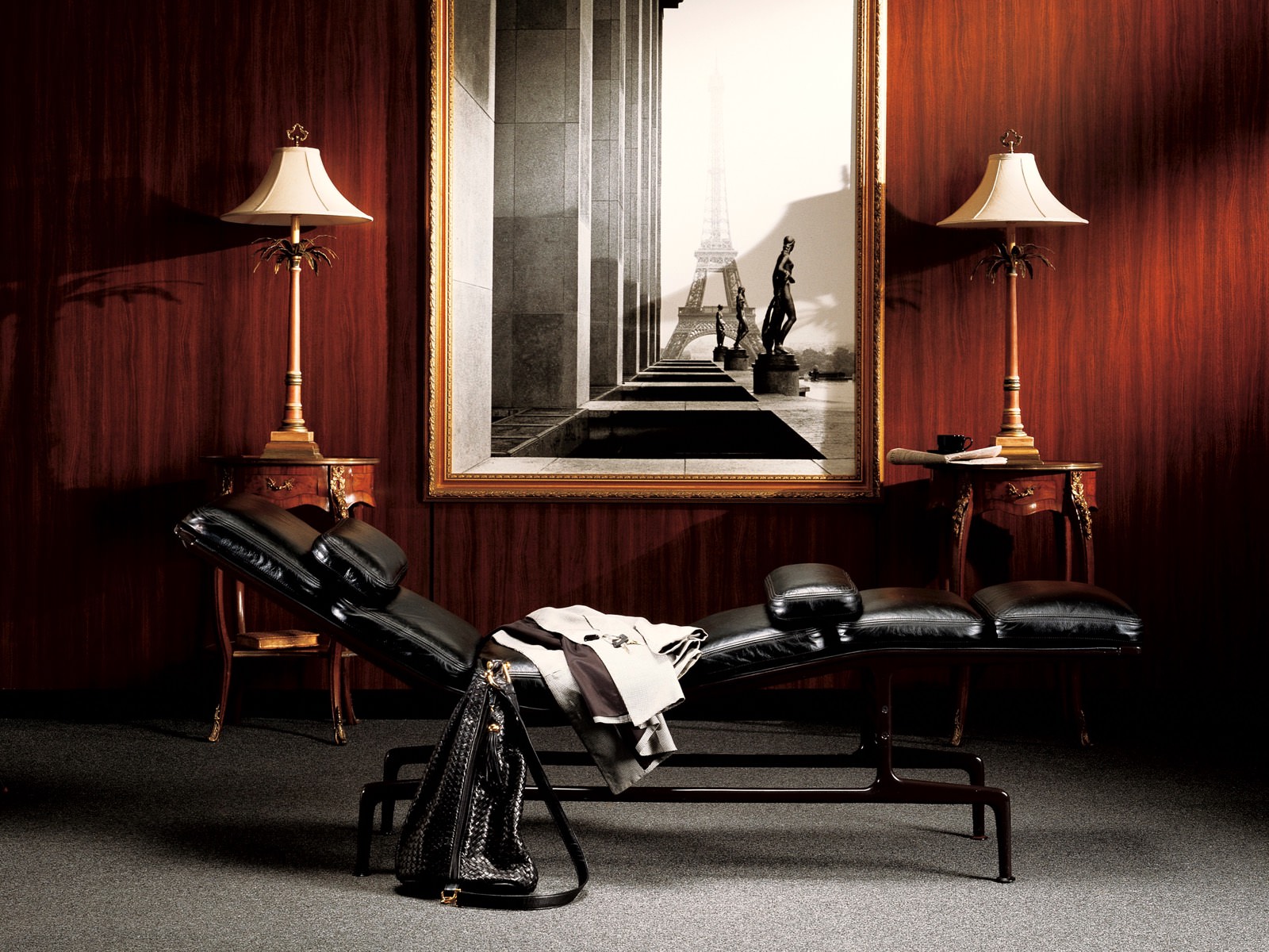 这款躺椅有着整洁的线条和如雕塑般的框架与底座,可谓一件艺术品。这款躺椅有三种颜色组合:茄紫色框架搭配黑色皮革和织物吊带;黑色框架搭配黑色皮革和织物吊带;白色框架搭配珍珠色皮革和白色织物吊带。