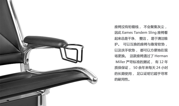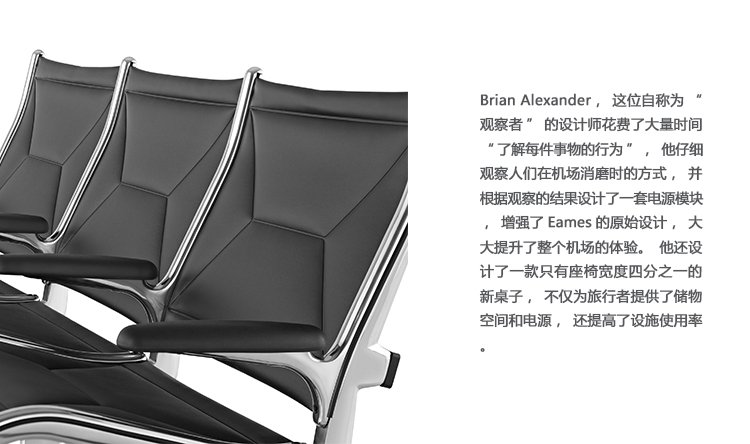Eames Tandem Sling座椅最初设计于1962年,多年来一直为成千上万在机场、火车站和其他公共场合等候的旅行者提供了一方寸舒适之地,经受住了时间的检验。集成电源让人们可以放松身心,在最需要的时候接入自己的设备,边充电边享受,无需劳神费心。