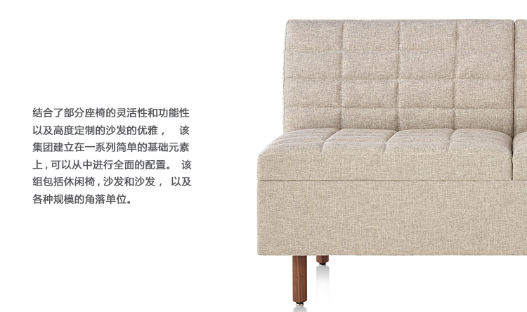 Tuxedo休闲座椅由细窄的钢腿提供支撑,金属支腿有6种饰面可选,靠背和(可选)扶手形成一条水平横线,让座椅的整个线条轮廓看起来十分低沉、流畅。超薄、双层泡沫衬垫外面包裹清新定制的装饰,让沙发看起来更加轻巧。每款装饰系列都包括有绗缝或无绗缝两种选项。