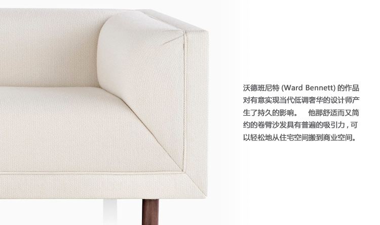 Ward Bennett的作品对追求现代低调奢华的设计师具有深远的影响。他设计的Rolled Arm沙发典雅而又简约,散发出迷人魅力,并可轻松满足家居和商用空间的需求。宽大的矮腿设计具有建筑上的层次感,利落的斜接软垫打造了优雅廓形。Rolled Arm架在凹陷的硬木腿上,以胡桃木或白蜡木精制而成,共有三种沙发尺寸,亦有俱乐部椅款式。