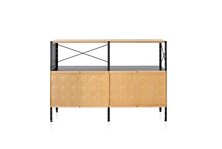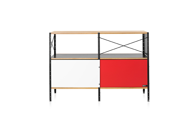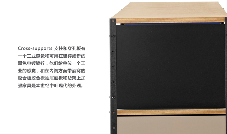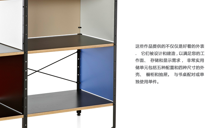 Eames存储单元由五种配置和四种大小的箱子、橱柜和抽屉组成。立柱、交叉支撑板和穿孔板要么是镀锌的,要么是黑色的;橱柜的正面是凹凸不平的胶合板;抽屉的正面和架子是模制的胶合板;箱体侧面和背面的面板是涂硬木的。可供您选择两种配色方案:中性色或亮色。