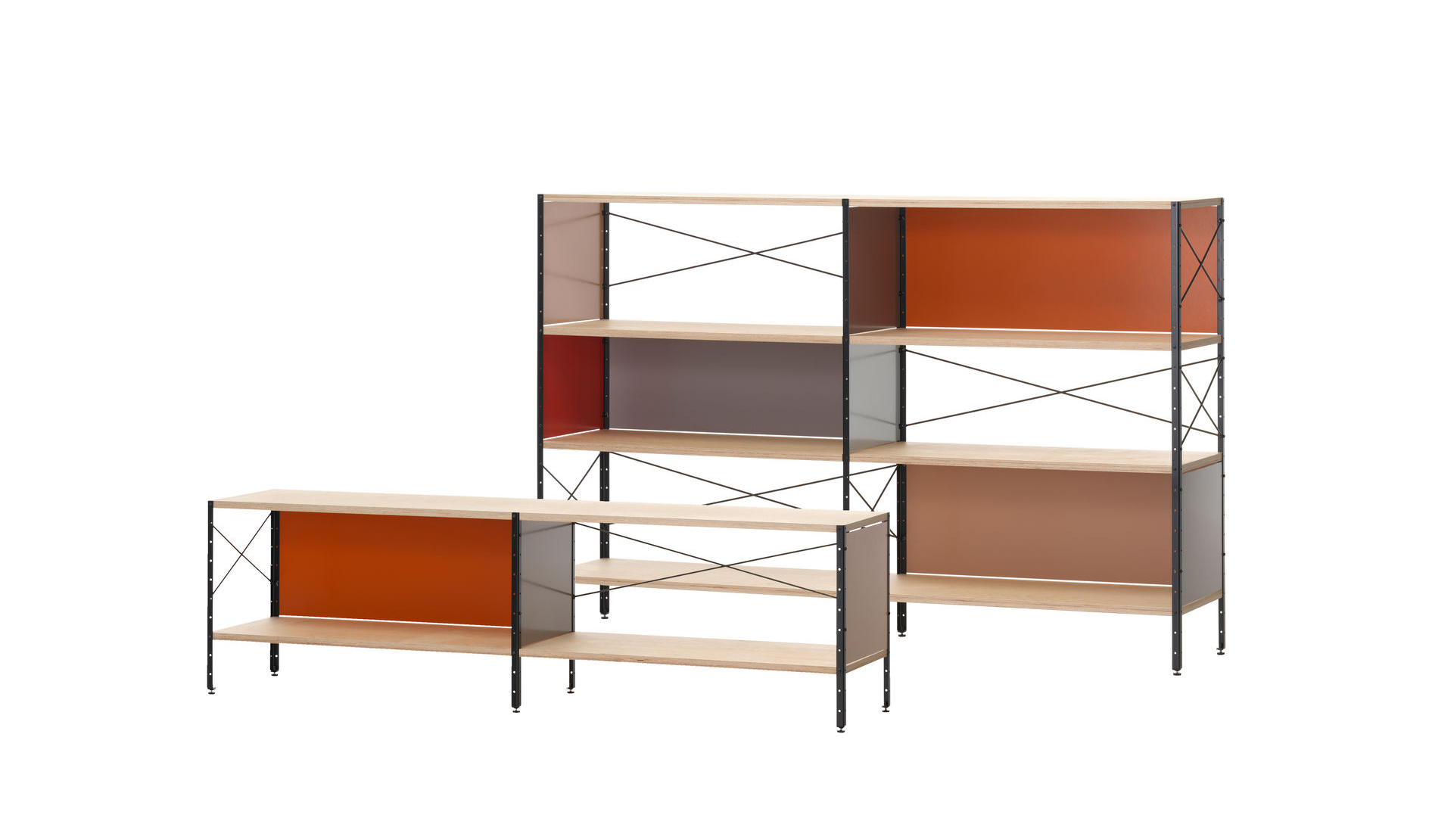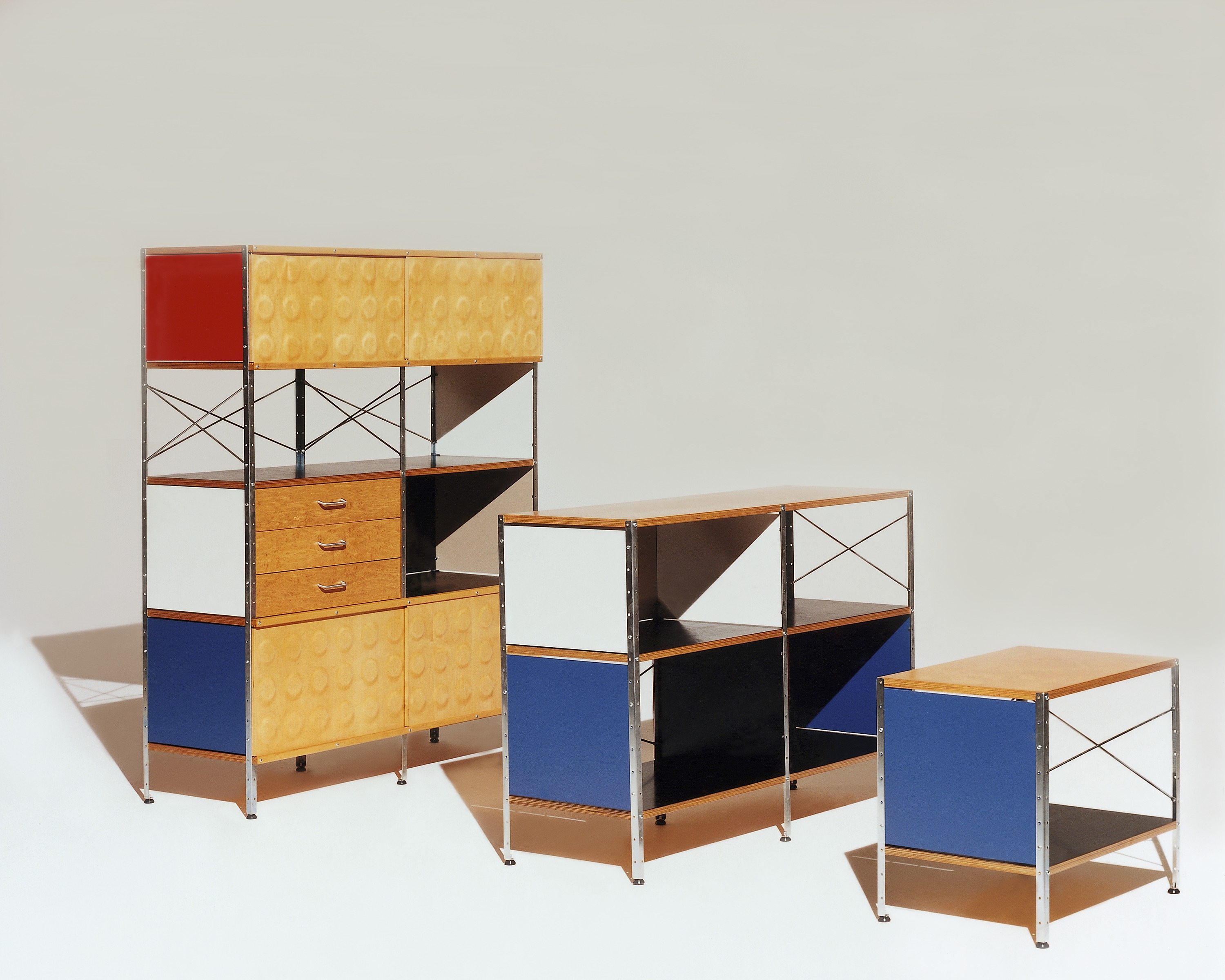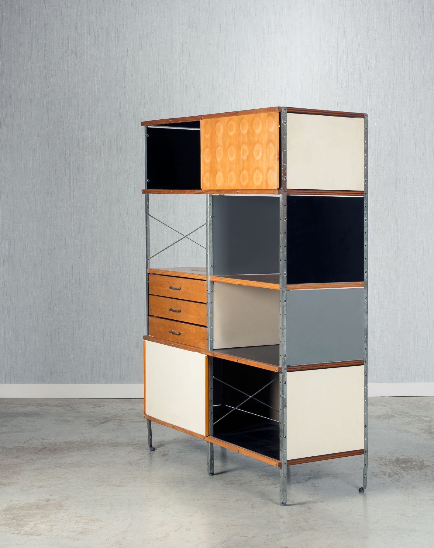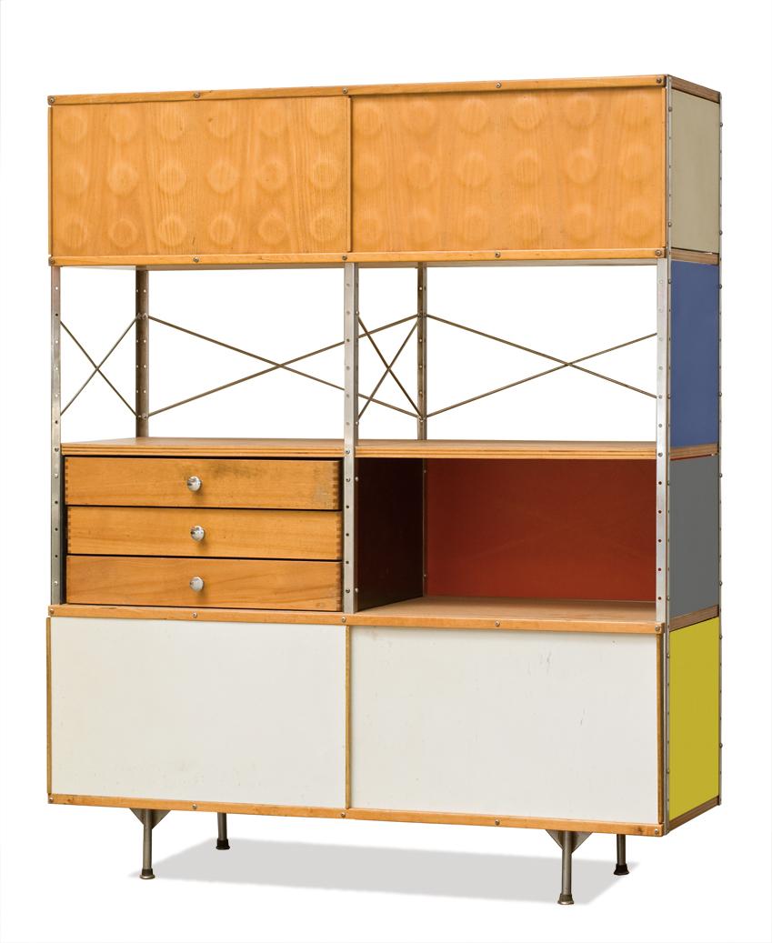 Eames存储单元由五种配置和四种大小的箱子、橱柜和抽屉组成。立柱、交叉支撑板和穿孔板要么是镀锌的,要么是黑色的;橱柜的正面是凹凸不平的胶合板;抽屉的正面和架子是模制的胶合板;箱体侧面和背面的面板是涂硬木的。可供您选择两种配色方案:中性色或亮色。