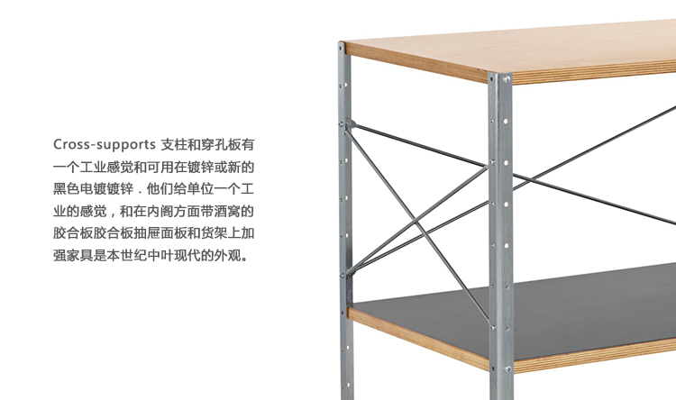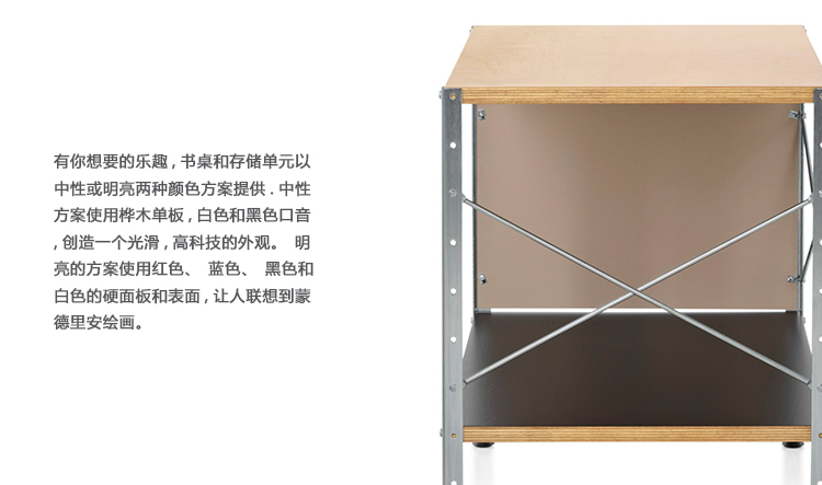Eames存储单元由五种配置和四种大小的箱子、橱柜和抽屉组成。立柱、交叉支撑板和穿孔板要么是镀锌的,要么是黑色的;橱柜的正面是凹凸不平的胶合板;抽屉的正面和架子是模制的胶合板;箱体侧面和背面的面板是涂硬木的。可供您选择两种配色方案:中性色或亮色。
