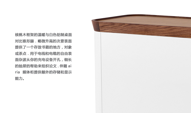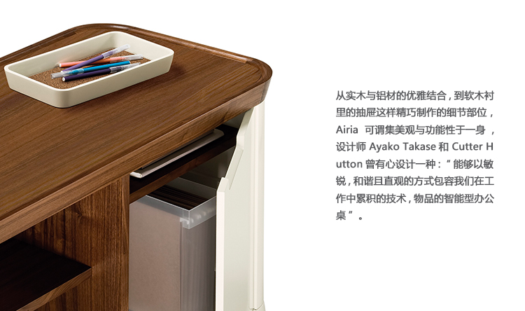 从优雅的木材和铝材组合到精心制作的细节,如软木衬里抽屉,Airia将美观与功能完美结合。 设计师Ayako Takase和Cutter Hutton的动机是设计一个“智能桌面,承认技术和我们在工作时积累的东西,但是以微妙,集成和直观的方式进行。”
