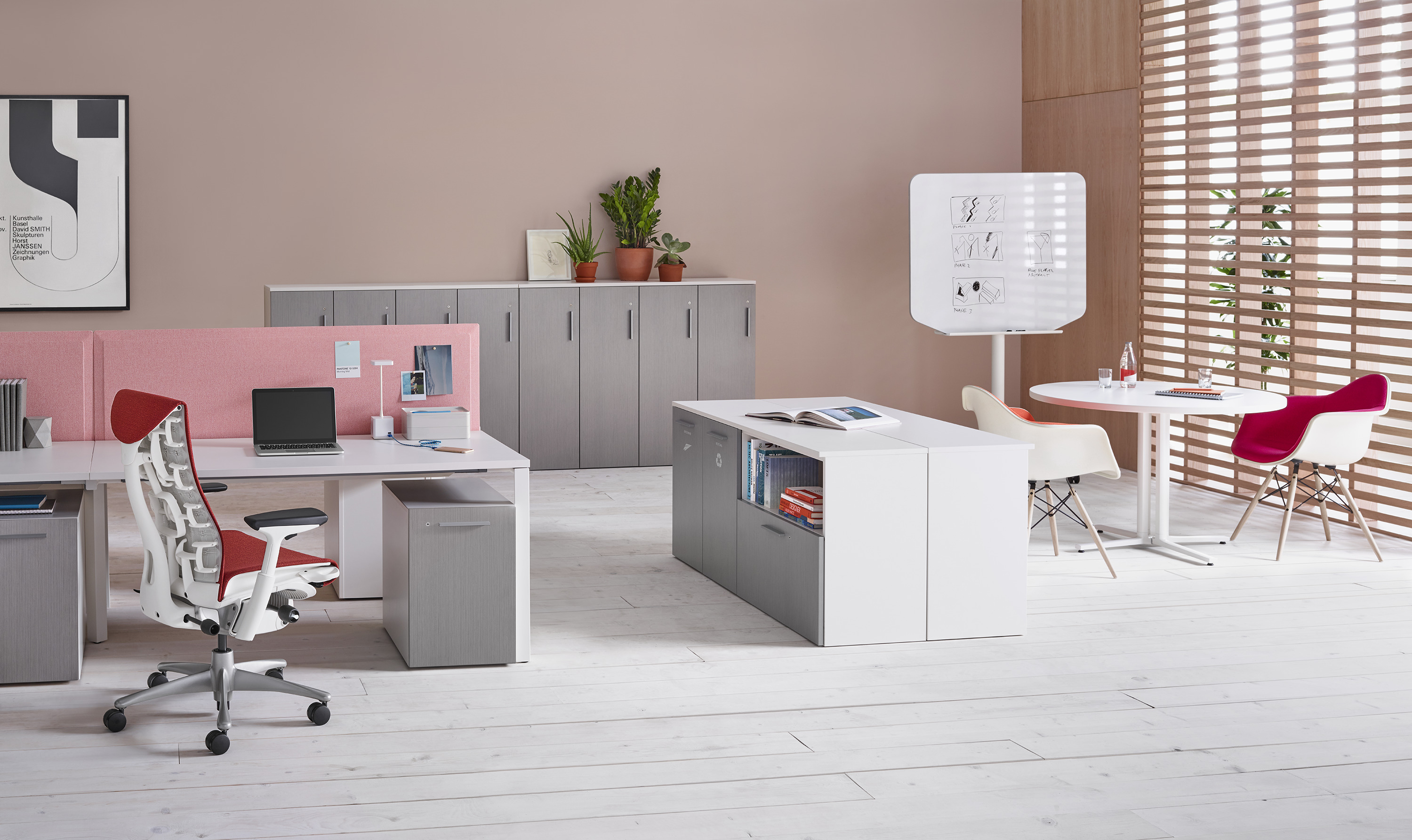 Pari是一个屏幕系列。 有些版本是独立式的,有些版本是贴在表面或框架上的,所有版本都是可粘的,并且共享无框架,薄的外形。 它们一致的细节和互补的颜色有助于美学的连续性,因为它们描绘了空间并提供了隐私。 Pari Screens与许多Herman Miller产品兼容,可在办公室环境中进行设置。 使用Pari Screens,组织可以压缩工作站并在较低的墙壁高度进行标准化,而不会牺牲员工所需的隐私,以便他们可以集中注意力,或创建个人空间的边界让他们感到舒适。