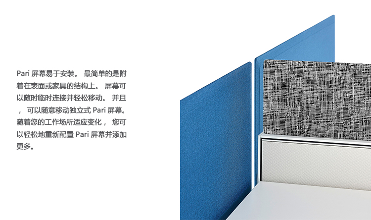 Pari是一个屏幕系列。 有些版本是独立式的,有些版本是贴在表面或框架上的,所有版本都是可粘的,并且共享无框架,薄的外形。 它们一致的细节和互补的颜色有助于美学的连续性,因为它们描绘了空间并提供了隐私。 Pari Screens与许多Herman Miller产品兼容,可在办公室环境中进行设置。 使用Pari Screens,组织可以压缩工作站并在较低的墙壁高度进行标准化,而不会牺牲员工所需的隐私,以便他们可以集中注意力,或创建个人空间的边界让他们感到舒适。