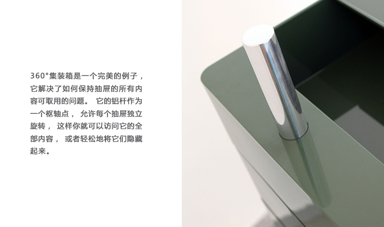 设计师康士坦丁.葛切奇以逻辑设计著称。他的360°集装箱设计是一个完美的例子,它解决了如何保持抽屉的所有内容可访问的问题。它的铝杆作为一个枢轴点,允许每个抽屉独立旋转,以便您可以访问其全部内容或隐藏起来轻松。由光滑的ABS塑料制成,可用橙色、白色和黑色。