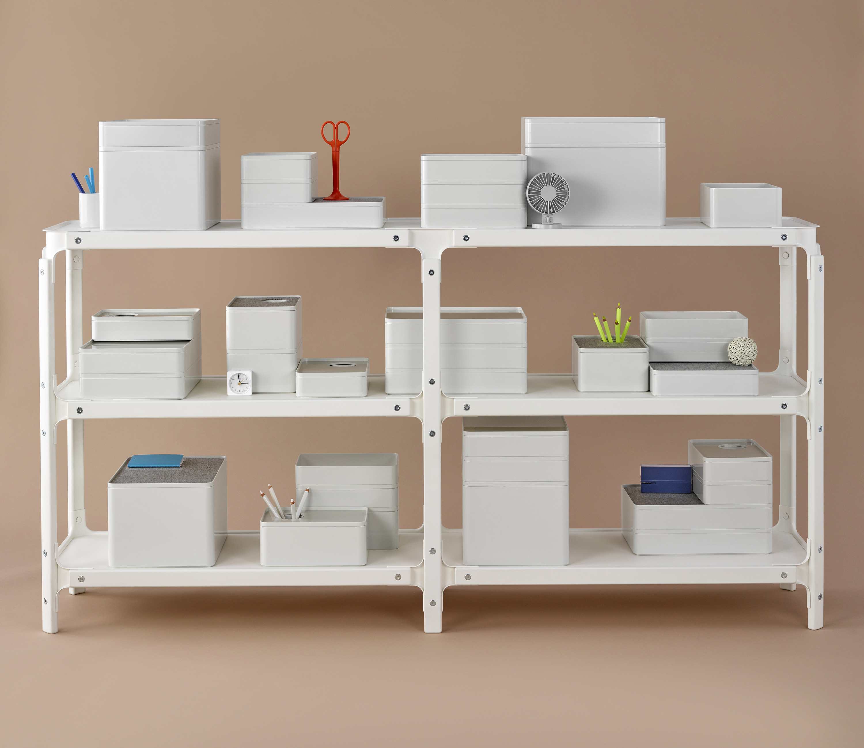 考虑到占据家庭及办公室空间的笨重物品的存放问题,Sam Hecht和Kim Colin设计了具有可拆卸盖子的储物盒。每个盖子上设计有孔洞,可供放置移动式笔筒。或者,笔筒可固定于储物盒内部孔洞下方压槽中,从而在无需打开盖子的情况下便可接触杯中物品。