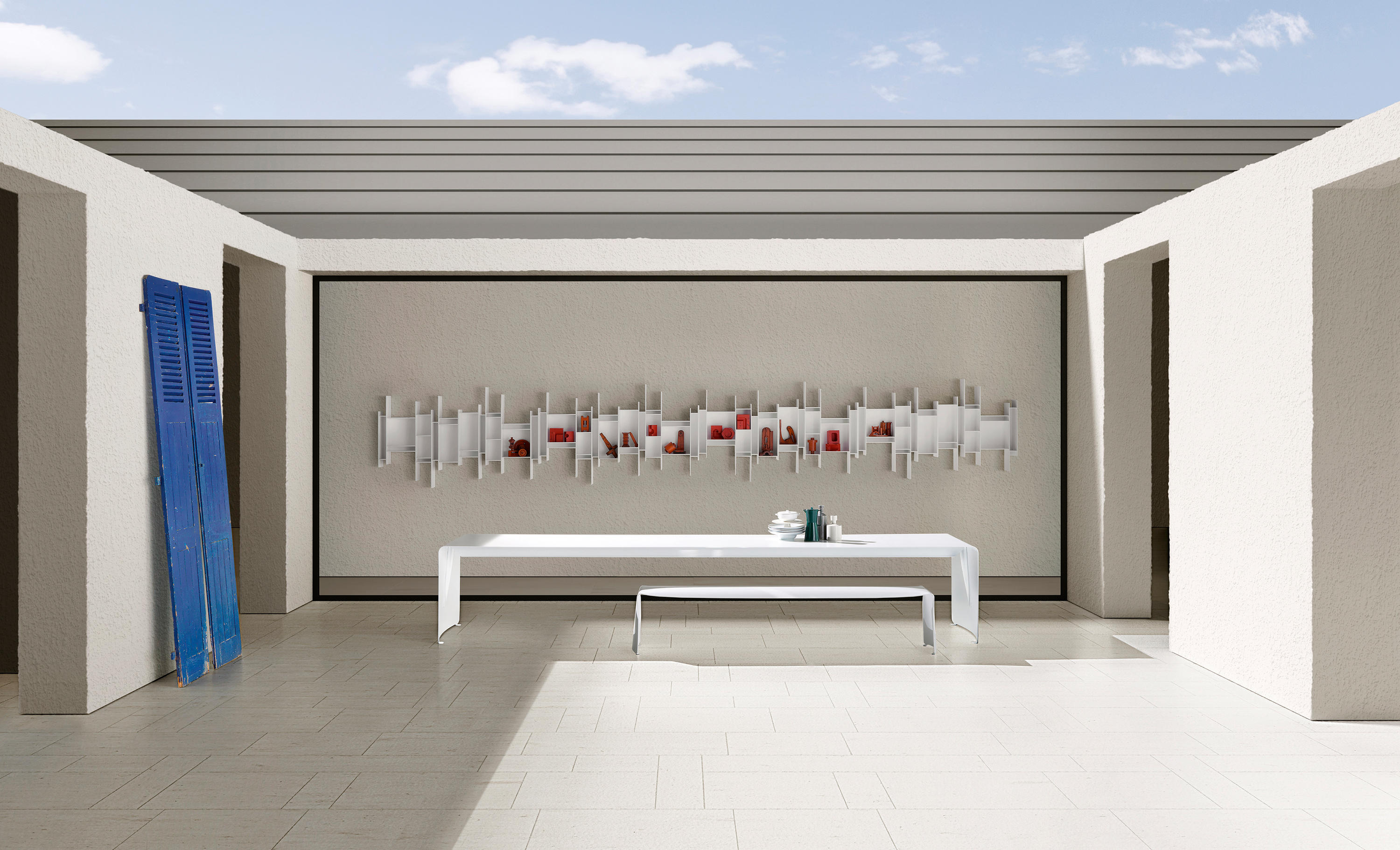 具有弯曲的自然铝片制成表。 表面处理: •铝涂漆 •亚光白漆 •光泽白漆 除了确保表的横向和纵向稳定性,加强梁(在高度70毫米使用表格240厘米,高度95毫米(更大的尺寸)和支撑的L形轮廓使得可以根据尺寸制造厚度不同的零件,从而在视觉上进一步改进它们:在80厘米宽的桌子中,铝厚度为5毫米,在90厘米宽的情况下表中的铝厚度为6mm。 身高73厘米。最大长度4.40米 室外使用 该表也适用于室外。
