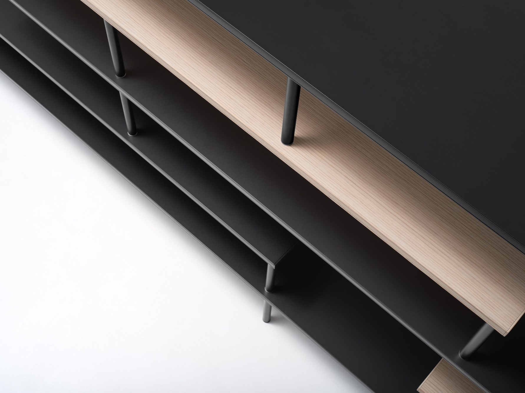 新成分:F,G,H,I,J 新饰面:哑光古铜色,哑光黑尼科尔漆,Canaletto胡桃木和漂白橡木。 正式的轻巧,图形标志,简单的设计,和谐的美学,必要性是让·努维尔设计(Jean Nouvel Design)设计的Super_Position书柜系列的标志。 重叠的线表示对水平度的重视。不间断的垂直线穿过架子,就像小跳水板一样延伸到空隙中。 物件,花瓶和雕塑可以在空的空间,重叠线的中间或末端的壁express中表达其比例差异。” Jean Nouvel