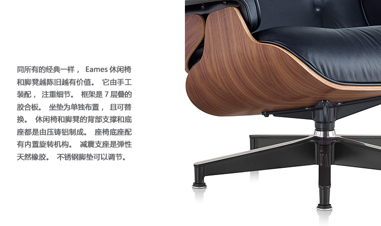 1956年知名由夫妻档设计师Charles & Ray Eames发表的lounge chair&Ottoman历经50多年的岁月,仍被视为现代家具史上最重要的经典设计家具之一,已经成为美国最重要的现代艺术博物馆MOMA的永久收藏品;椅子的压铸铝制部分则是以铝合金镀鉻,让整体视觉呈现轻盈興现代感.
