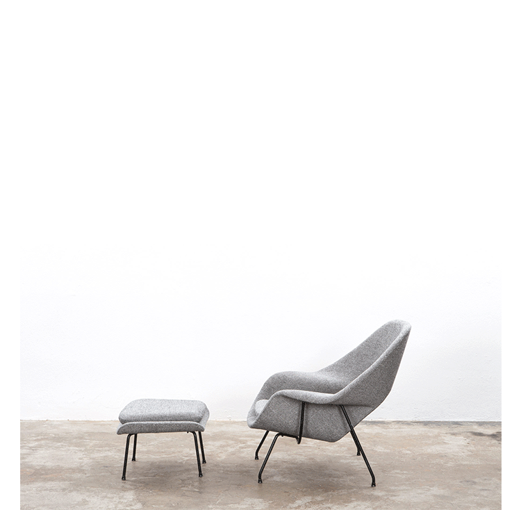 Womb Chair 的基本构造是由抛光镀铬或雾面钢管底座,以一体成型的泡棉包覆框架所组成。 Eero Saarinen 设计这张椅子挑战了一般世俗的规则,打破窠臼,树立了新的现代设计和舒适的标准,充分显示他的高超才华。