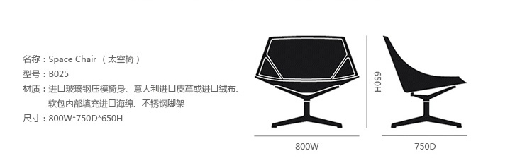 太空椅是由德国设计师 Jehs和Laub设计的。两人的灵感来源于人体与自然设计本身的能力。他们的追求是让事情简单化,不要太不自然。太空椅系列的设计想法源于坐在一只舒适的手感觉。设计的线形类似于小路,公路和田野景观。太空椅有白色、黑色或灰色,多样的抛光。椅子的制作采用纤维面料和皮革衬垫,外壳用漆合成材料,底部是用漆钢制成,使之与外壳颜色匹配。