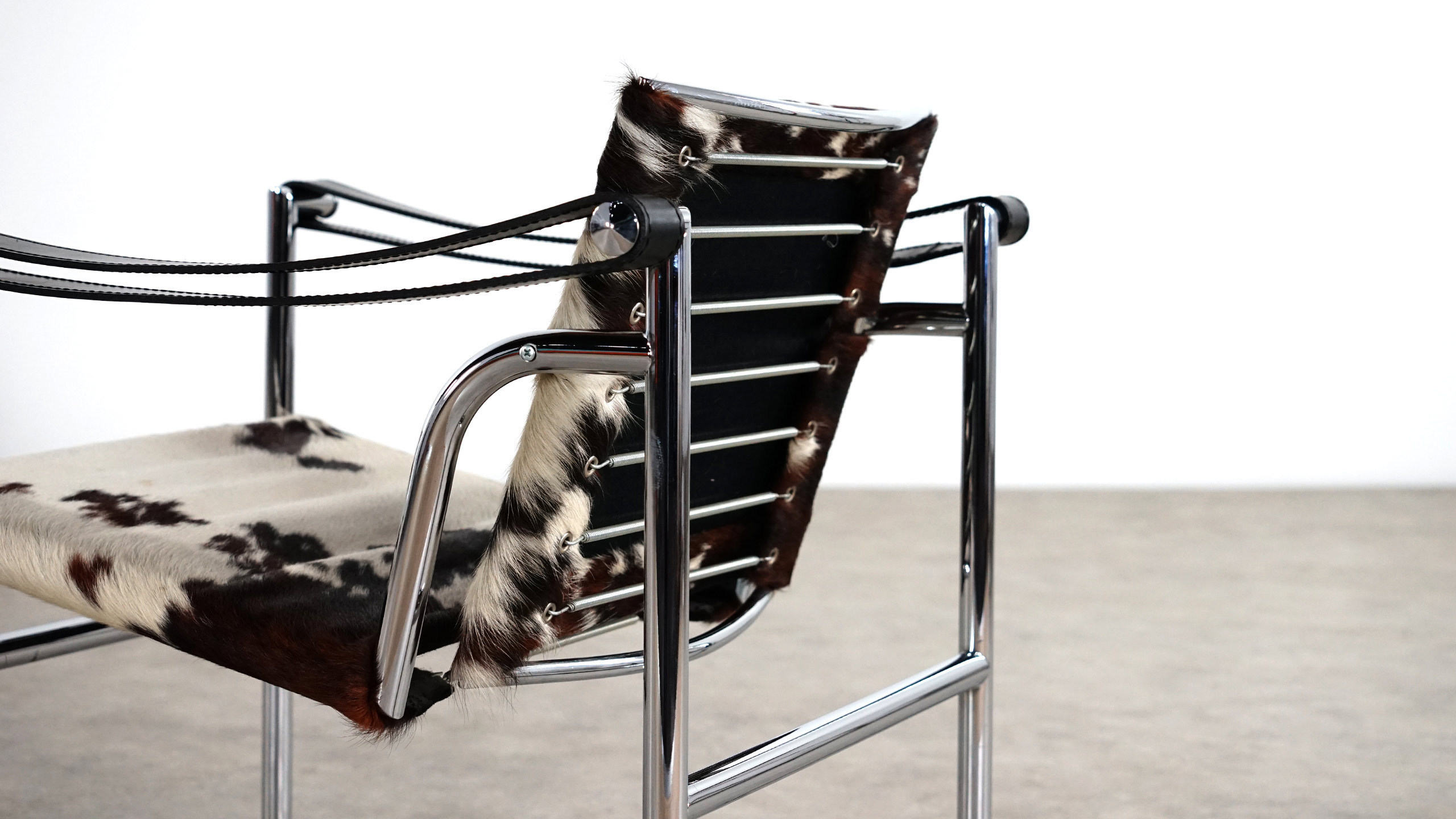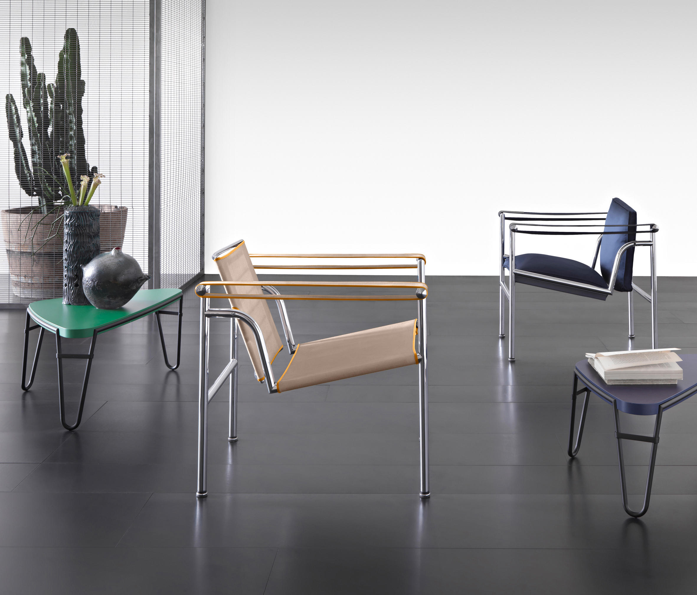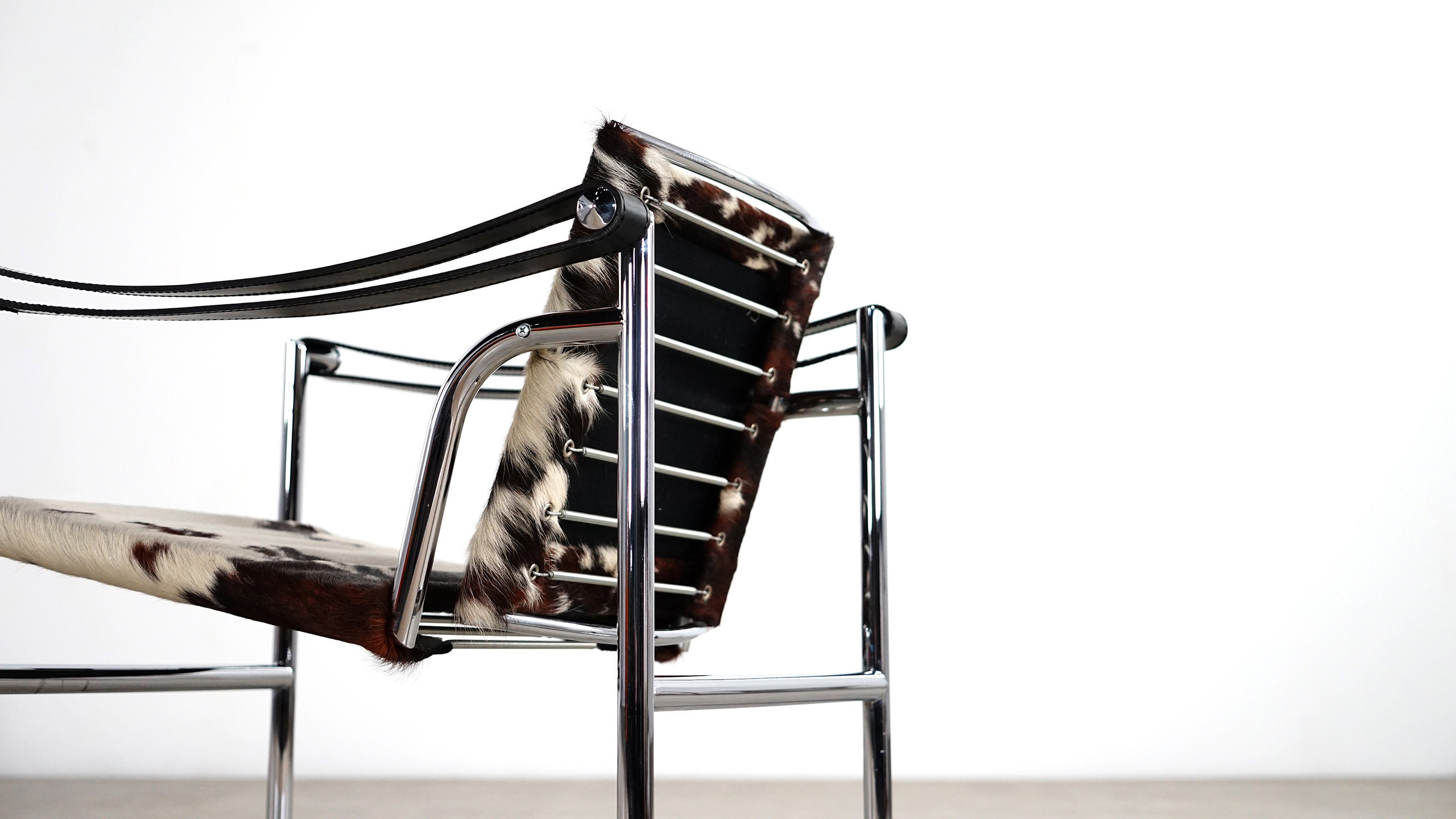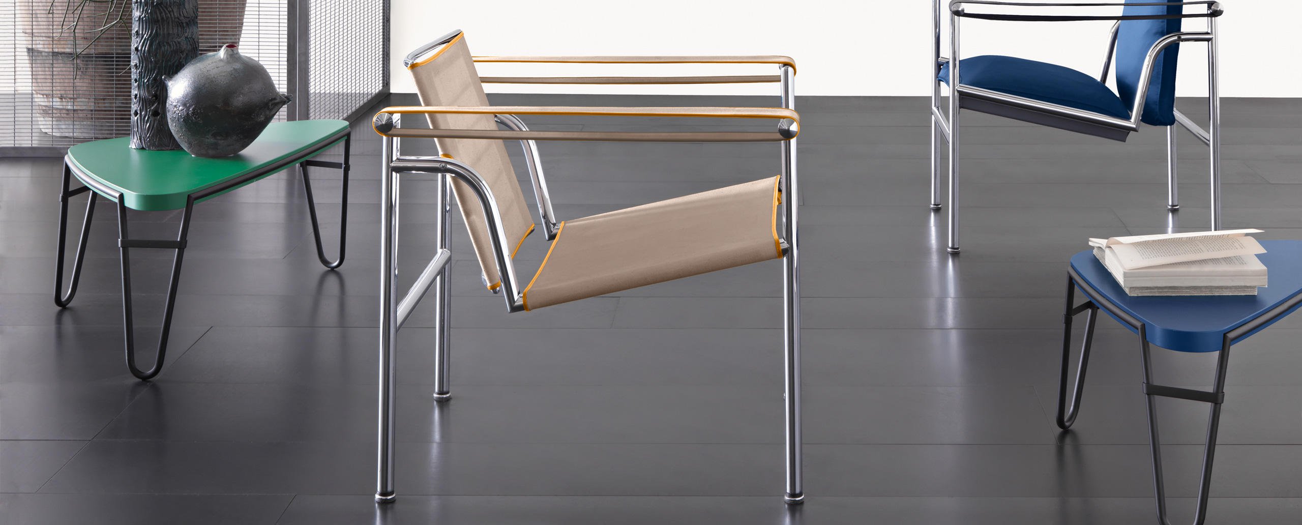 1928年诞生的LC1一款扶手椅Ville-d’Avray,采用环保的CR3三价镀铬钢结构。由建筑设计师设计,采用聚氨酯软垫座面和靠背,可提供更好的舒适性。扶手椅前面较宽,向后逐渐收窄。蓝缎饰面;扶手前端带有灰色皮革镶边。这款扶手椅是1928年专为Villa Church à Ville-d’Avray设计的,坐垫和靠背的填充满足客户的最舒适要求。1928年还为收藏家Raoul La Roche的艺术馆创造了一款类似的填充模型。这些原型用于更精确地定义1929秋季沙龙模型的结构。