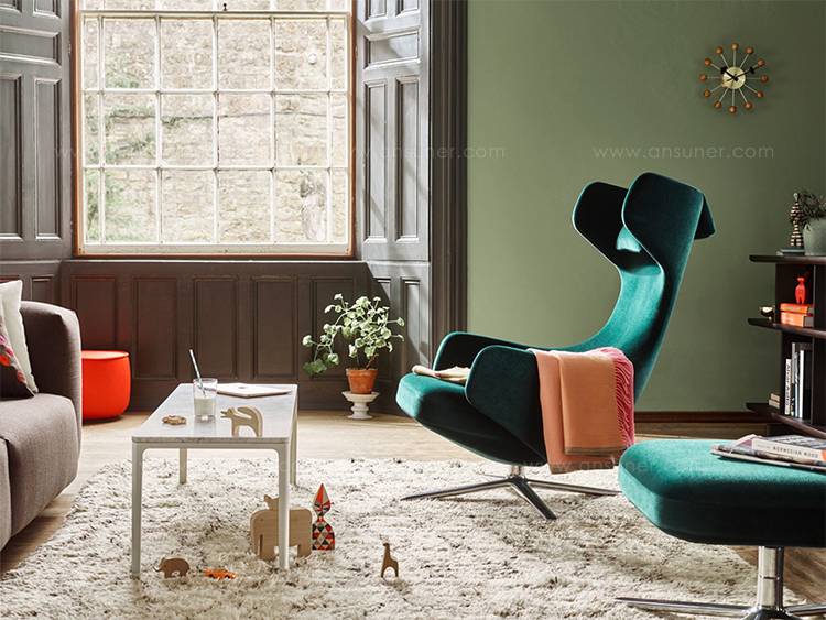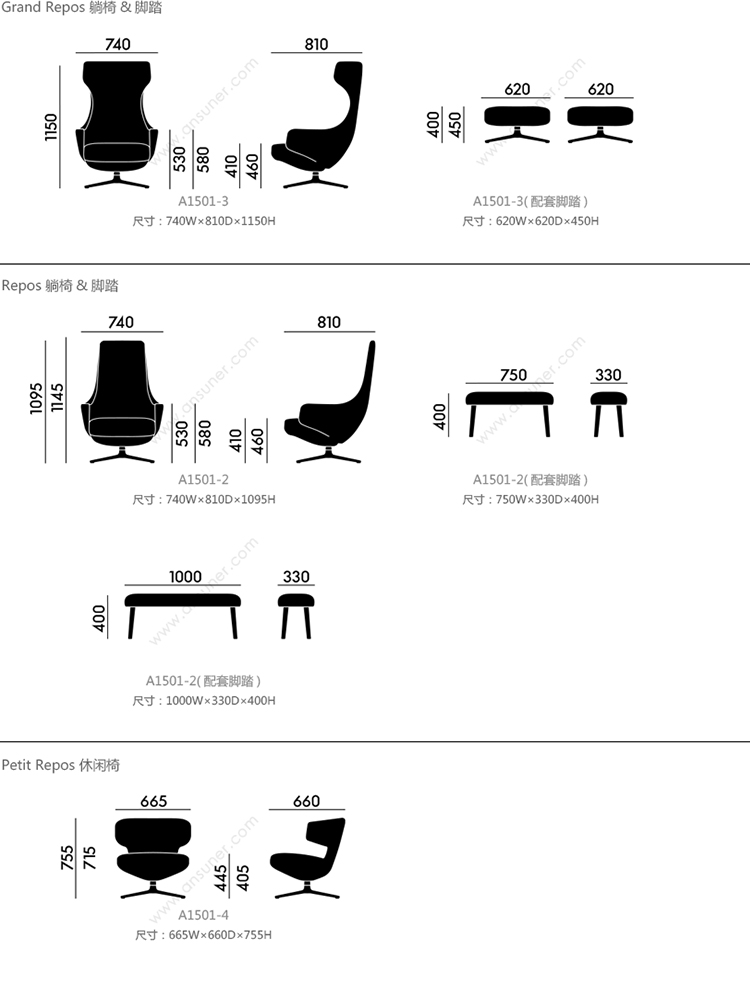 “grand repos lounge chair and ottoman(grand repos 休闲椅&脚踏)由设计大师Antonio Citterio所设计的独特的,绝无仅有的休闲椅系列,椅子的创作面临的挑战如同伊姆斯夫妇当初设计著名的伊姆斯休闲椅一样,但正因如此,才能成为绝世经典。grand repos系列休闲椅采用钢制铝合金脚架、聚氨酯海绵填充、高级布艺扪面,可随意调整坐姿和高度,也可以放平躺,配上舒适的羽毛衬垫,无论阅读或者休憩,都非常舒服,符合人体工学,高档舒适,是办公,会议的理想选择。意大利设计师和建筑师 Antonio Citterio赋予了这边椅子永恒的优雅气质与无与伦比的舒适,是当代设计的经典,无论用在办公、商业、家庭都是非常高贵大气的。”