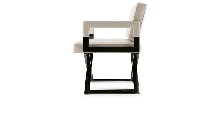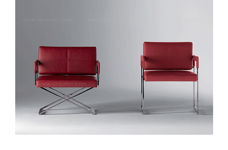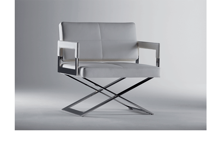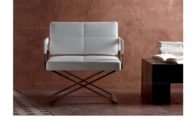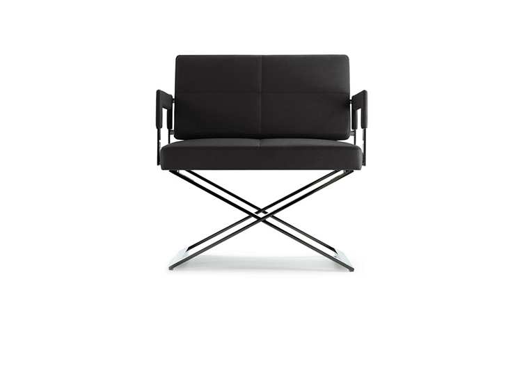 "Leather皮革椅系列家具线条干净简明,“X”交叉造型或者“H”造型脚架支撑着坐垫,新颖独特,由Jean-Marie Massaud设计。它采用外露的金属架,有三种不同的做工,座椅为聚氨酯泡沫材料,靠背较低,坐垫宽敞。有两种面料可供选择:天然皮革和纺织面料。两种款式都有皮革和染色纺织面料的扶手和同款的靠枕。沙发椅的造型形式严谨,它的特点和个性特征与Poltrona Frau现代室内家居的设计非常统一协调。