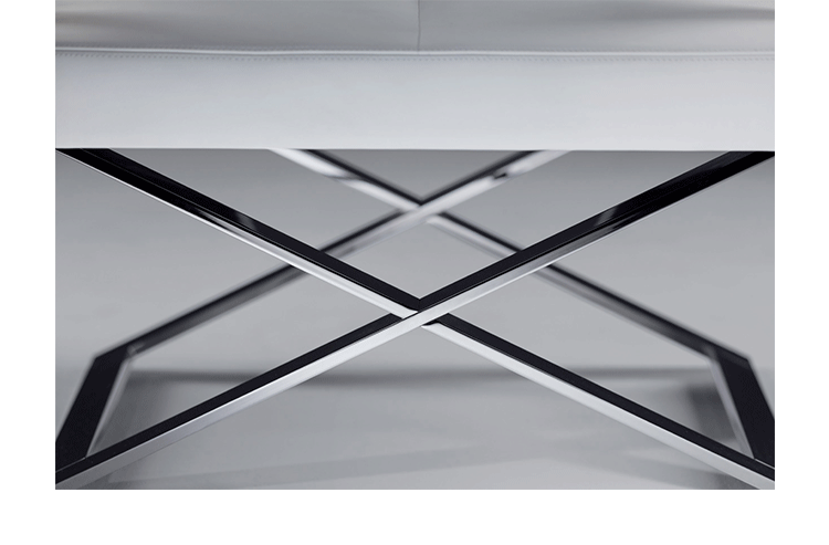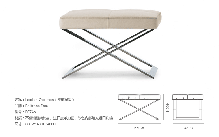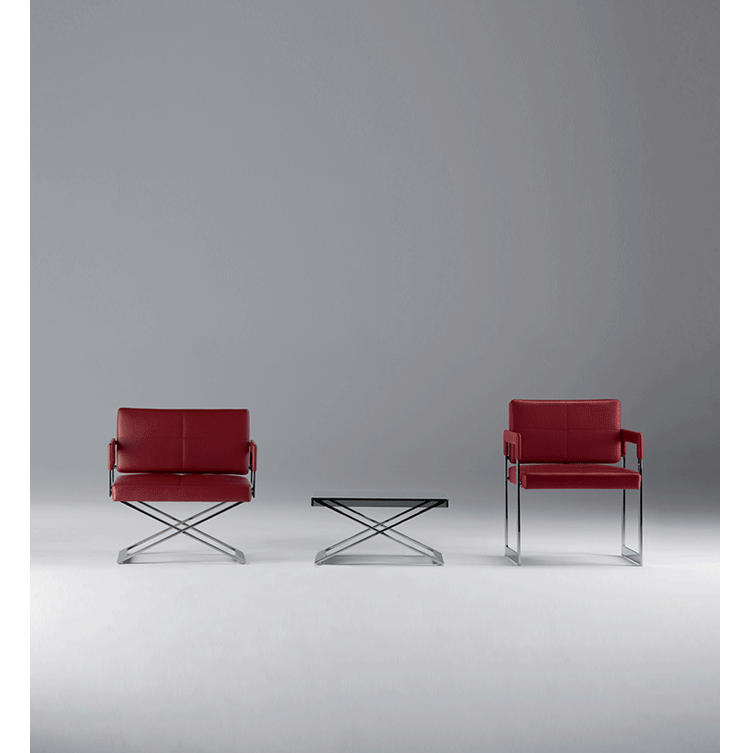 "Leather皮革椅系列家具线条干净简明,“X”交叉造型或者“H”造型脚架支撑着坐垫,新颖独特,由Jean-Marie Massaud设计。它采用外露的金属架,有三种不同的做工,座椅为聚氨酯泡沫材料,靠背较低,坐垫宽敞。有两种面料可供选择:天然皮革和纺织面料。两种款式都有皮革和染色纺织面料的扶手和同款的靠枕。沙发椅的造型形式严谨,它的特点和个性特征与Poltrona Frau现代室内家居的设计非常统一协调。