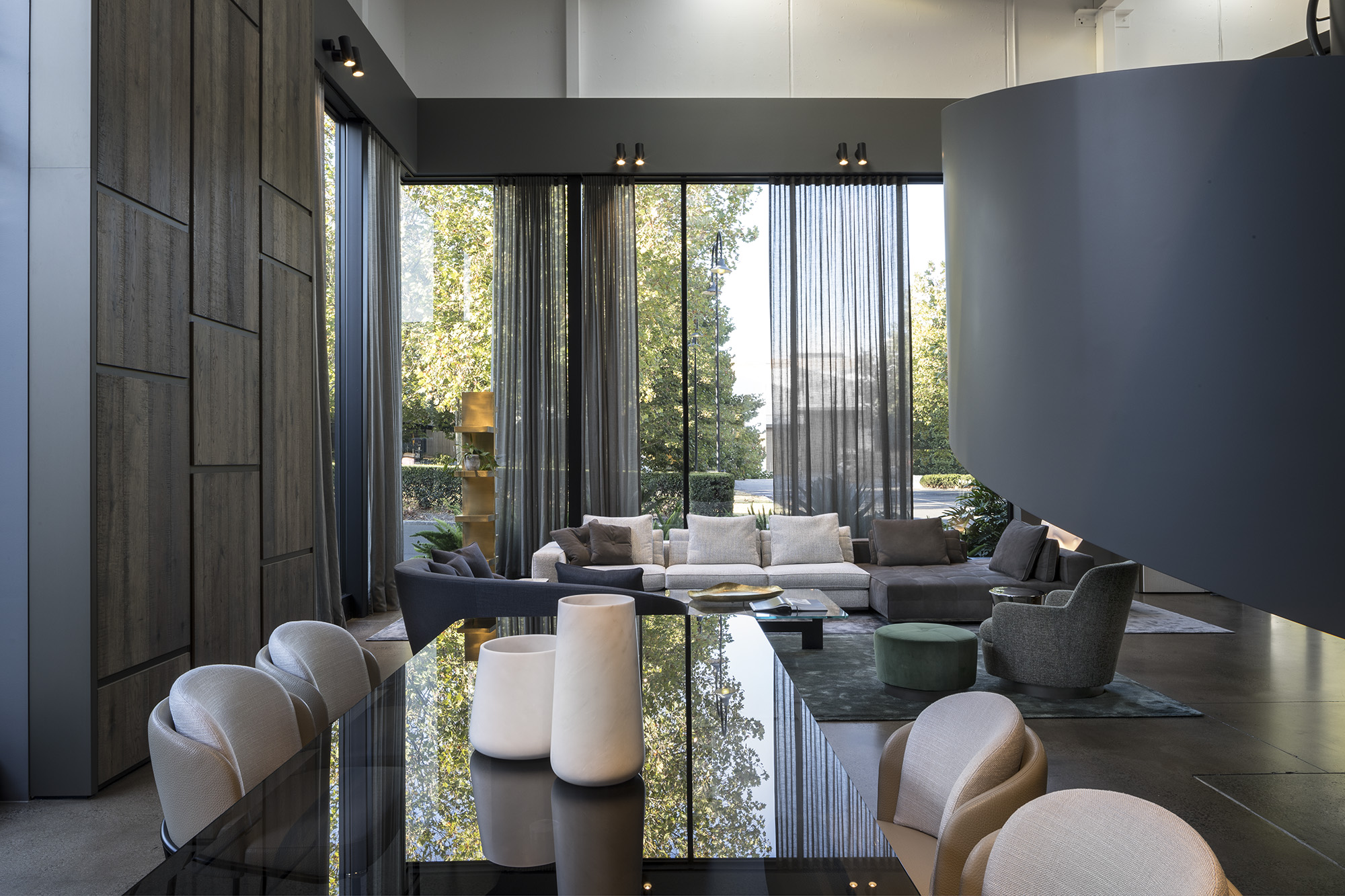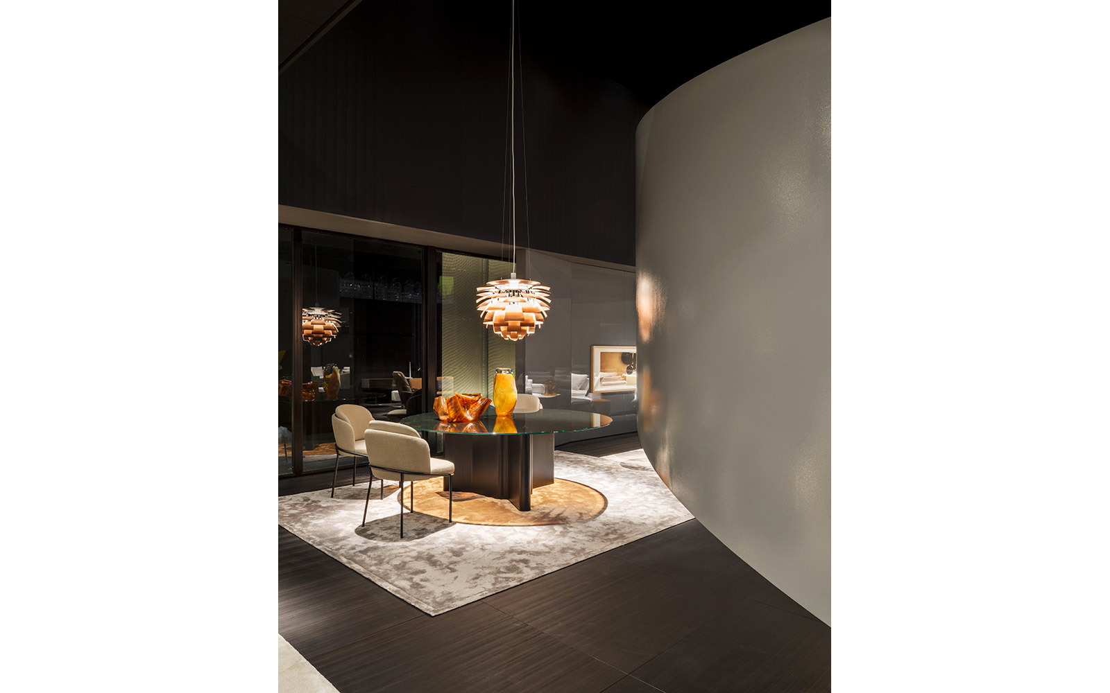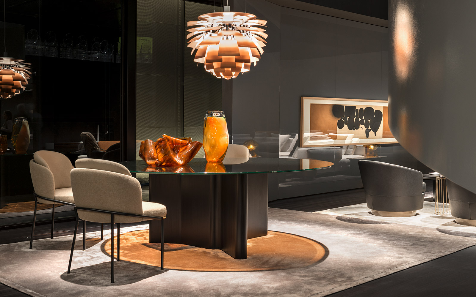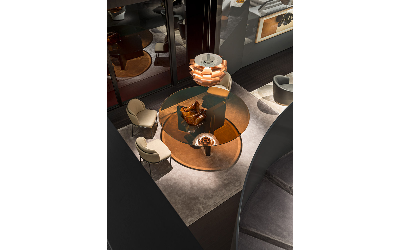 软垫座椅搭配优雅修长的椅腿,其材质为亚光黑色的金属管,亮光金色、黑镍金属色或浅铜色的细节使其倍显精致。