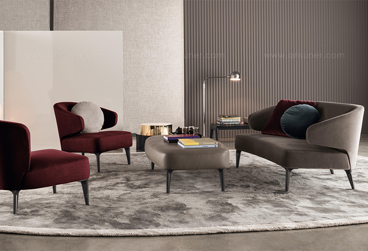 沙发的围裹式靠背特色十足,扶手线条与之完美呼应,以蓝灰色调呈现的压铸铝合金支脚尽展精致设计之美。