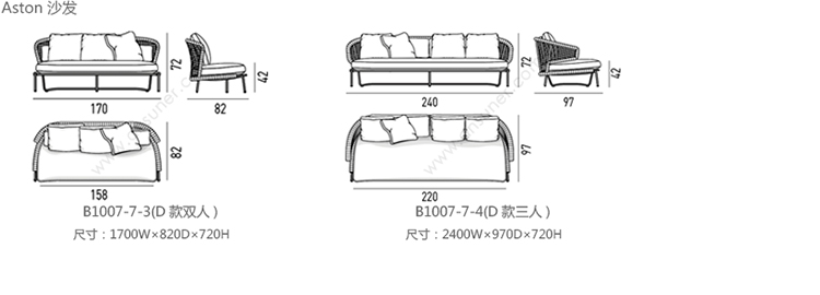 Aston是一个单品家族系列,其中包括沙发、沙发床、扶手椅、脚凳、座椅,为家居环境和“共享空间”提供优雅而时尚的装饰,在室内和室外皆可应对自如。阿斯顿“绳”户外系列采用金属材质的构架,搭配Pewter色聚酯漆面,部件都针对户外环境而经过特别处理,覆面采用疏水性纤维面料。靠背采用直径为7毫米的特殊聚丙烯纱线编织而成,两种颜色可供选择:浅灰色和深棕色,与全新Art Lifescape 02系列的面料和Alison “Dark Brown”户外系列的色调相得益彰。针对户外环境的特点,金属构架经过特别处理,搭配Pewter色聚酯漆面,覆面采用特殊聚丙烯纱线编织而成,有两种颜色可供选择:浅灰色和深棕色。坐垫采用Minotti Studio独家设计并通过激光加工而成的几何装饰。靠垫的内部填充物是高弹性聚氨酯泡沫,覆面采用疏水性纤维面料。