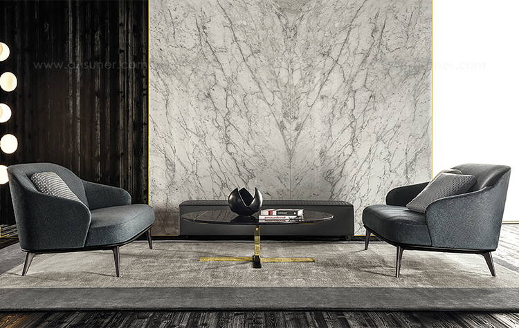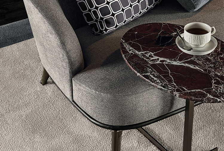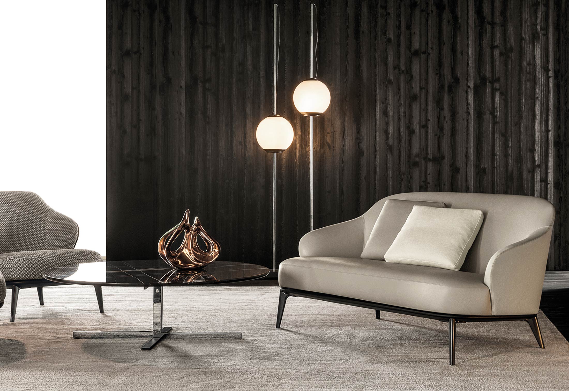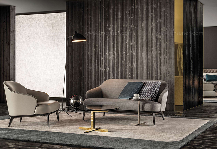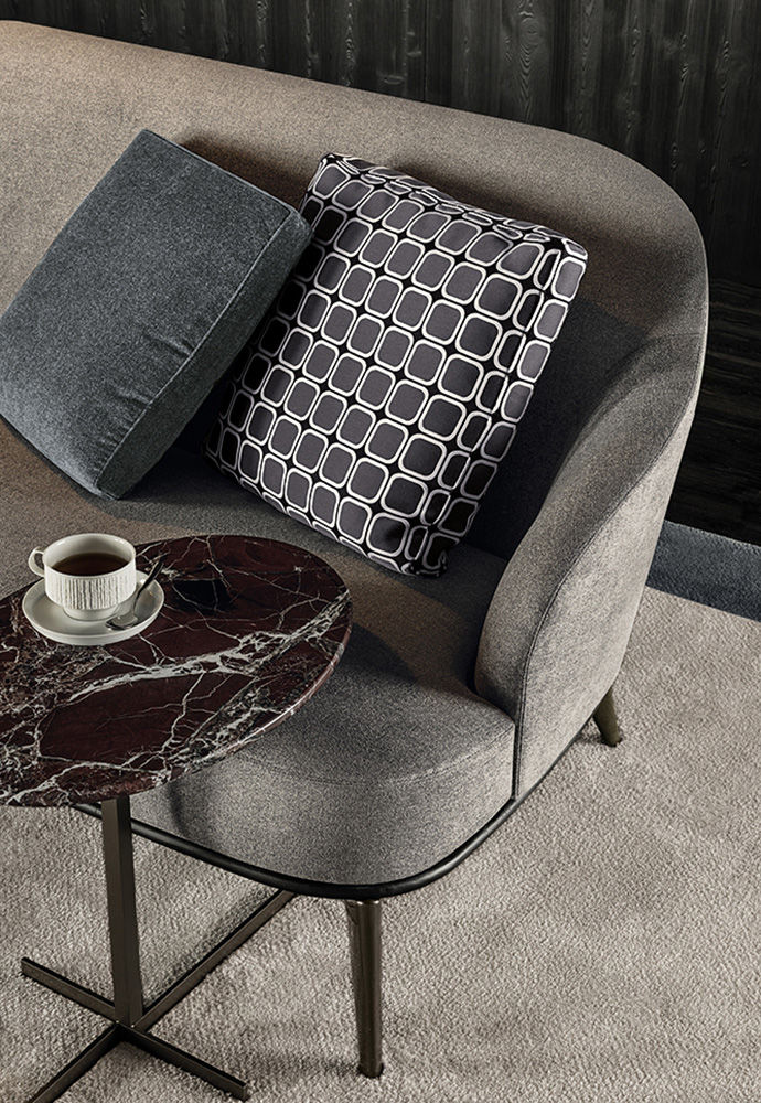 莱斯利沙发拥有轻盈的造型,精致的覆面展现出公司产品一贯的高超工艺。弧形的靠背采用记忆海绵填充材料,带来绝佳的舒适感。沙发构架为Moka色的开孔橡木实木。Leslie沙发的地面支撑脚为压铸铝,漆面为Pewter色。Leslie沙发的造型紧凑,不仅可以用于较小的居住空间,还可以用在接待场所,如休息厅、等候室、行政办公室,平添一份优雅的氛围。与其同名的扶手椅拥有多种外观组合,包括外部的皮革覆面以及内部的皮革或织布覆面,而Leslie沙发仅推出单一材料覆面的款型,也就是完全采用皮革覆面,或者完全采用织布覆面,可以在Minotti独家面料库不胜枚举的方案中尽情选择。