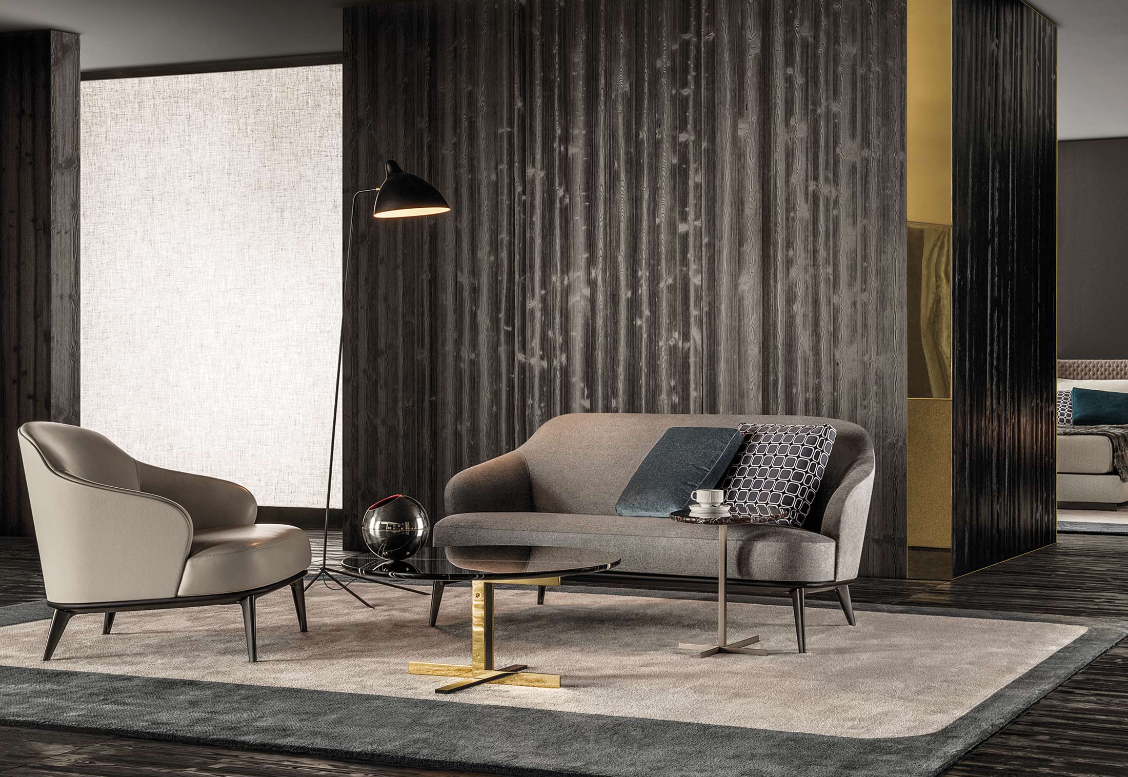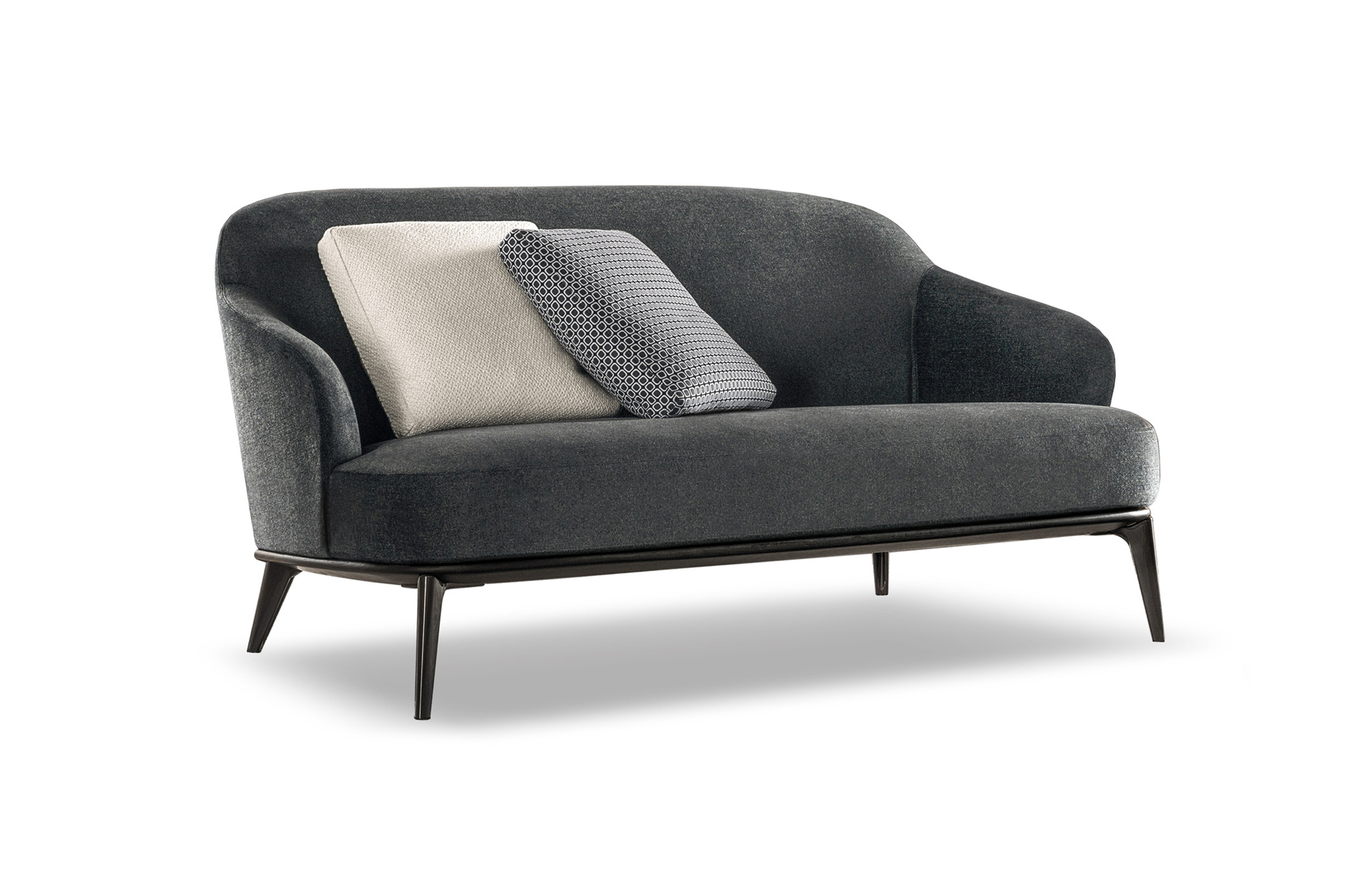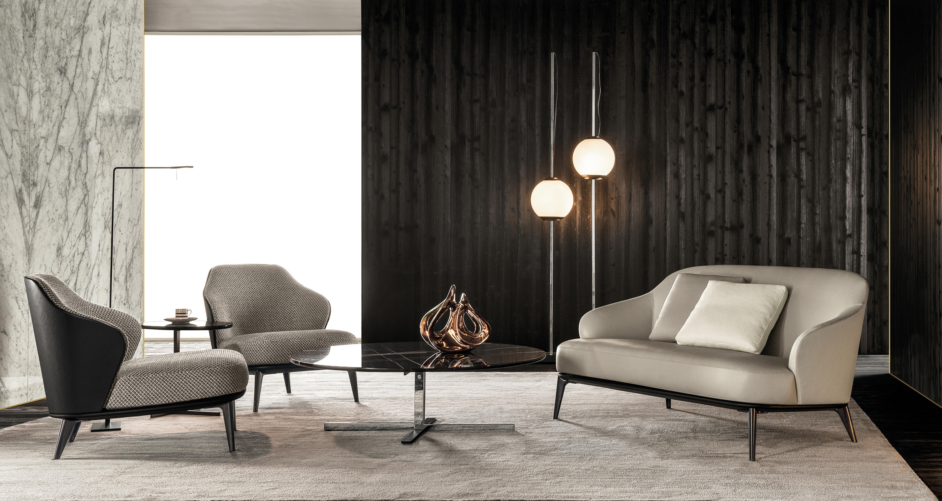 莱斯利沙发拥有轻盈的造型,精致的覆面展现出公司产品一贯的高超工艺。弧形的靠背采用记忆海绵填充材料,带来绝佳的舒适感。沙发构架为Moka色的开孔橡木实木。Leslie沙发的地面支撑脚为压铸铝,漆面为Pewter色。Leslie沙发的造型紧凑,不仅可以用于较小的居住空间,还可以用在接待场所,如休息厅、等候室、行政办公室,平添一份优雅的氛围。与其同名的扶手椅拥有多种外观组合,包括外部的皮革覆面以及内部的皮革或织布覆面,而Leslie沙发仅推出单一材料覆面的款型,也就是完全采用皮革覆面,或者完全采用织布覆面,可以在Minotti独家面料库不胜枚举的方案中尽情选择。