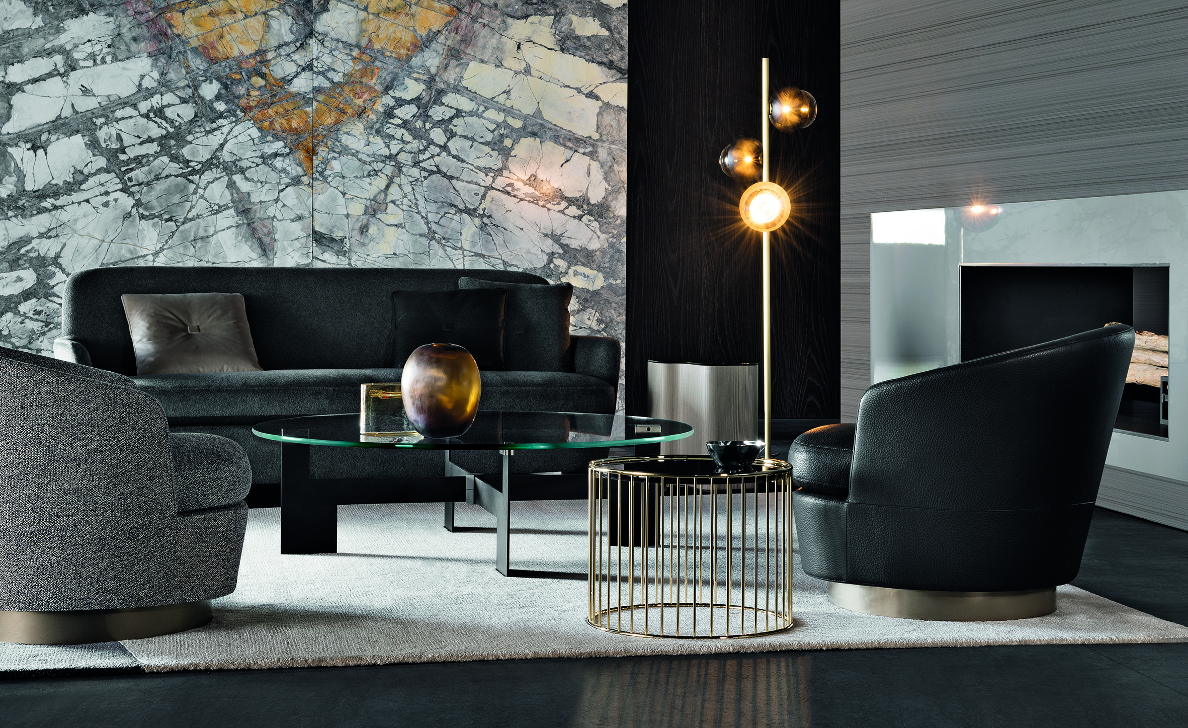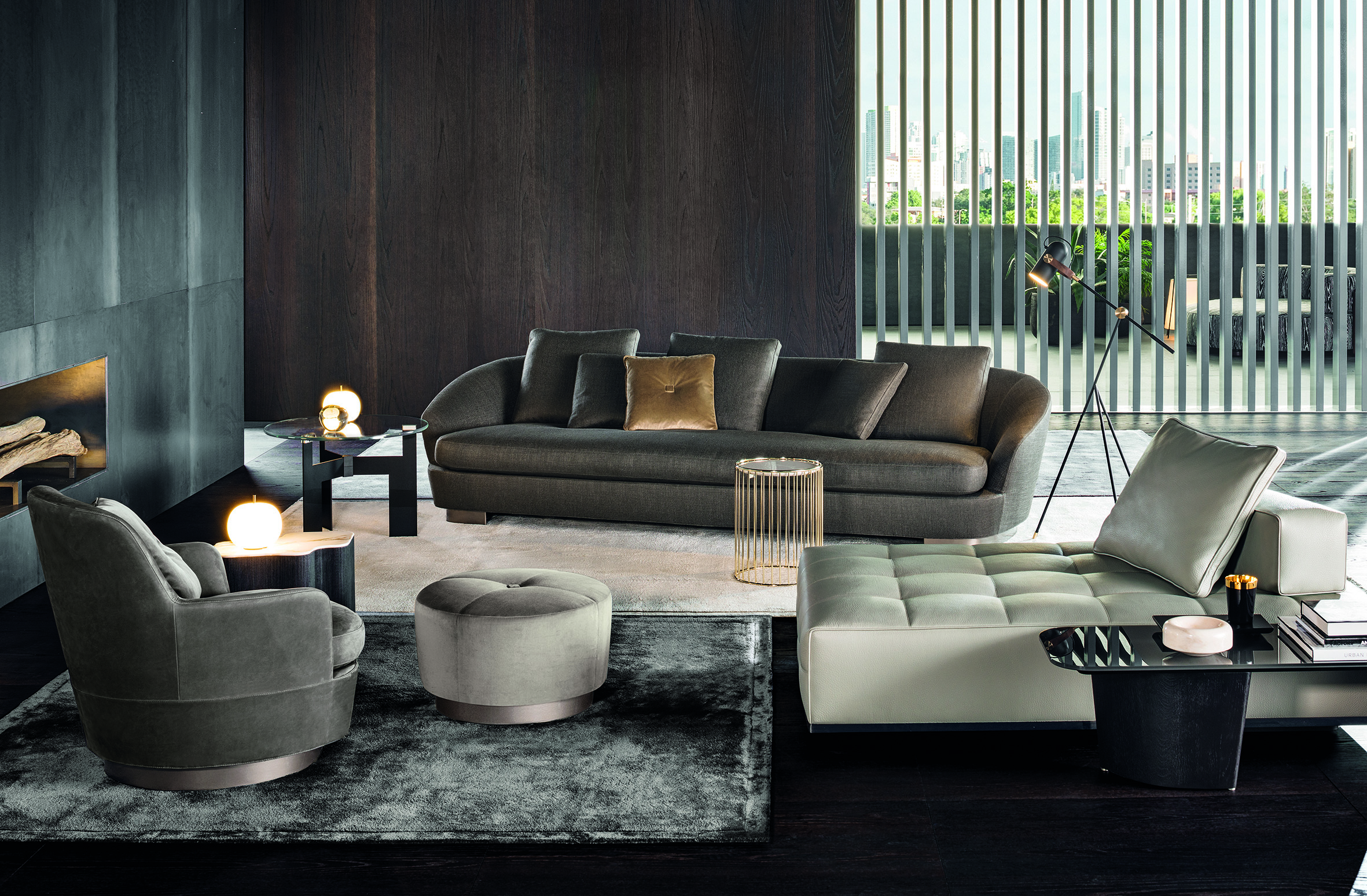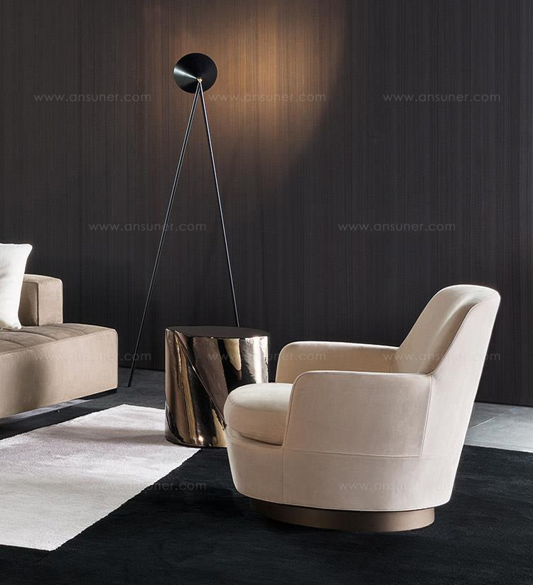 柔和的造型、紧凑的比例和具有视觉冲击力的细节呈现出精致的美学语言,金属基座采用淡铜色的表面设计。
