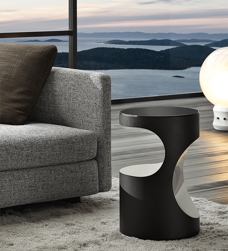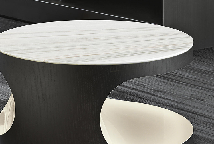 Boden有两种不同的高度和不同的比例,在侧桌版本中更纤细,在咖啡桌的解决方案中更紧凑,Boden被黑色的pate de verre或Zebrino大理石覆盖。