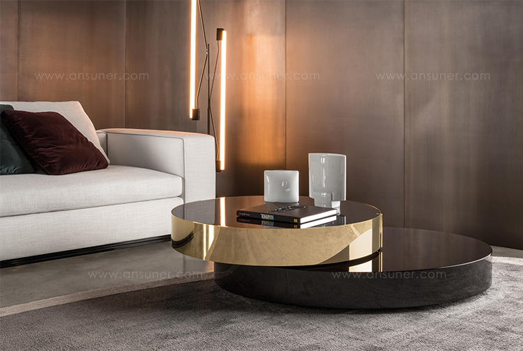 重叠的造型搭配珍贵的材质,这就是Benson的独特之处。木材的质感和金属的光亮感完美展现出雕塑般的造型。Benson边几可以直接放置在地面上,有两种不同的尺寸可供选择,以满足不同的功能需求。尺寸为120x95厘米的版本,基座为椭圆形,上方面板为圆形,配备的机械装置可以使其旋转360度,增强边几的延展性,使其更加靠近沙发座椅。直径为46厘米,高度为38厘米的版本,专门用于放置在沙发和扶手椅的侧方,有以下组合可供选择:一种是下方台面为亮面乌木,上方台面为亚光铜色板材;另一种是下方台面为Moka色亮光漆,上方台面为金色亮光漆。
