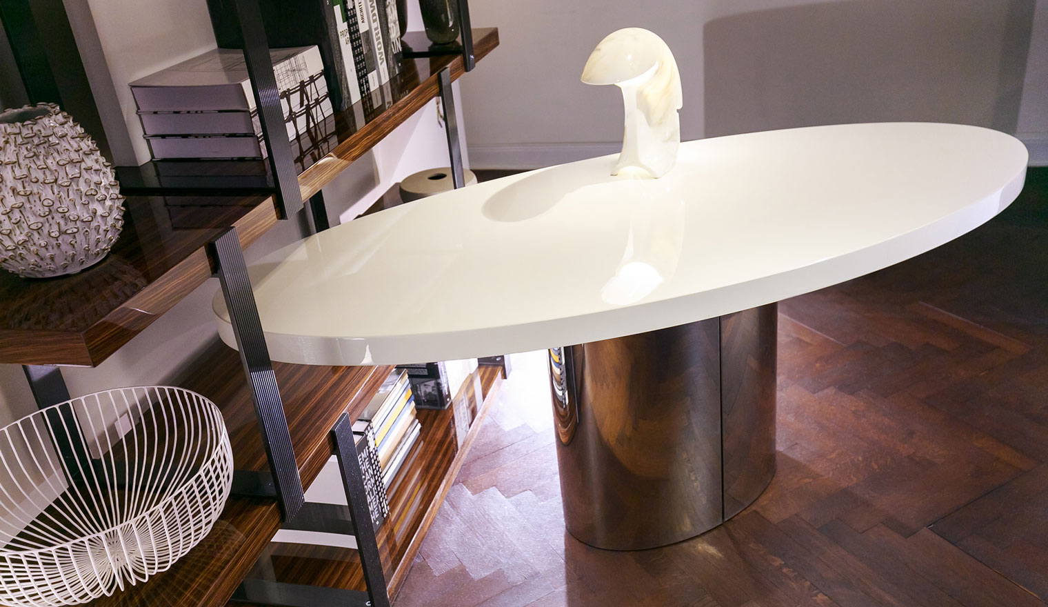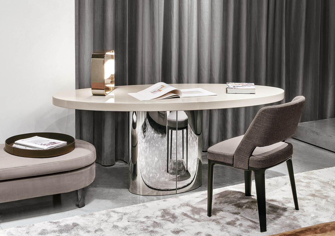 体积与造型的游戏,大胆的不对称性,一切似乎是对地心引力的挑战。这就是Raymond的美学理念。这款产品有两种高度可供选择,61厘米和74厘米。椭圆的造型是基座和台面的主题元素,基座采用镀铬金属制成,台面的亮光漆色彩缤纷:白色,Sand色,紫色,绿色和花岗石色。