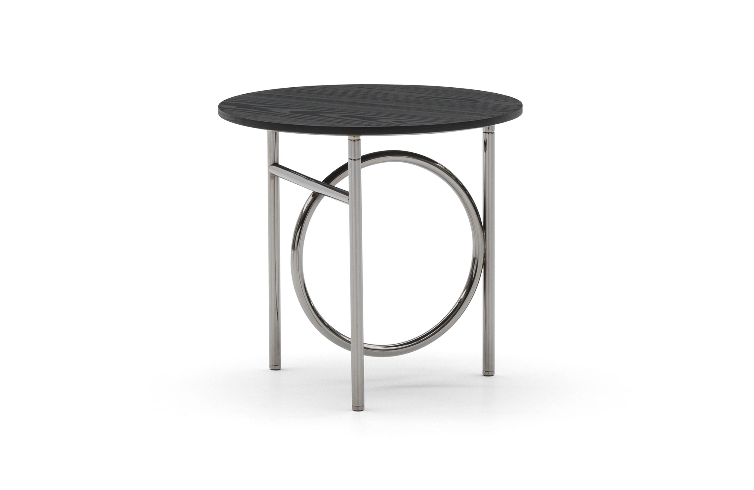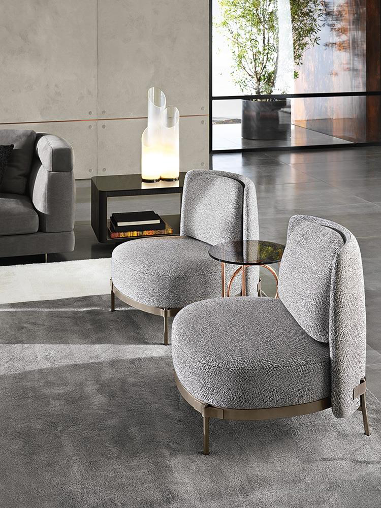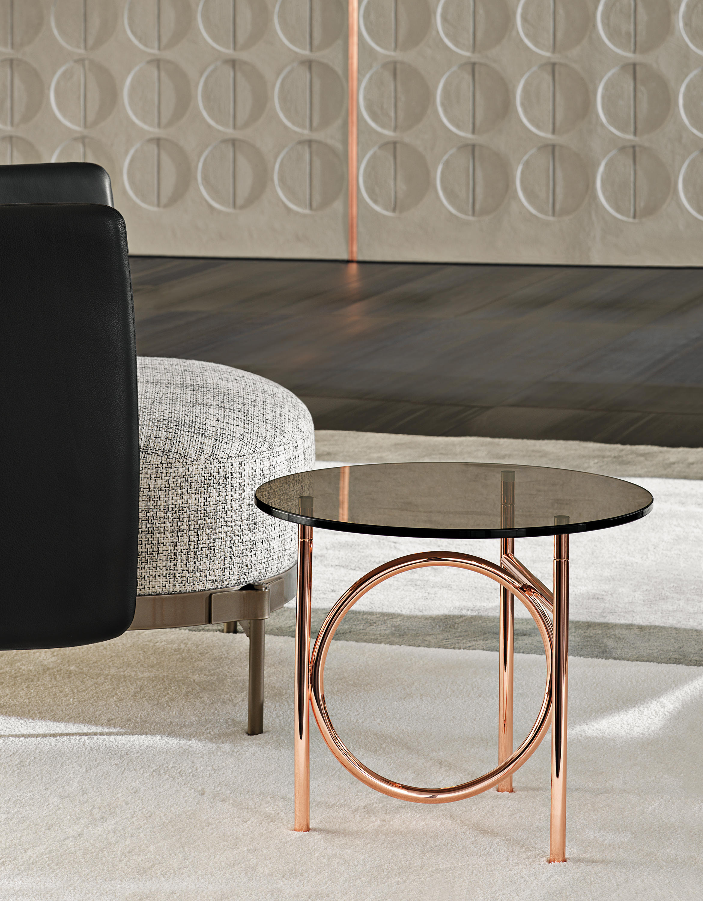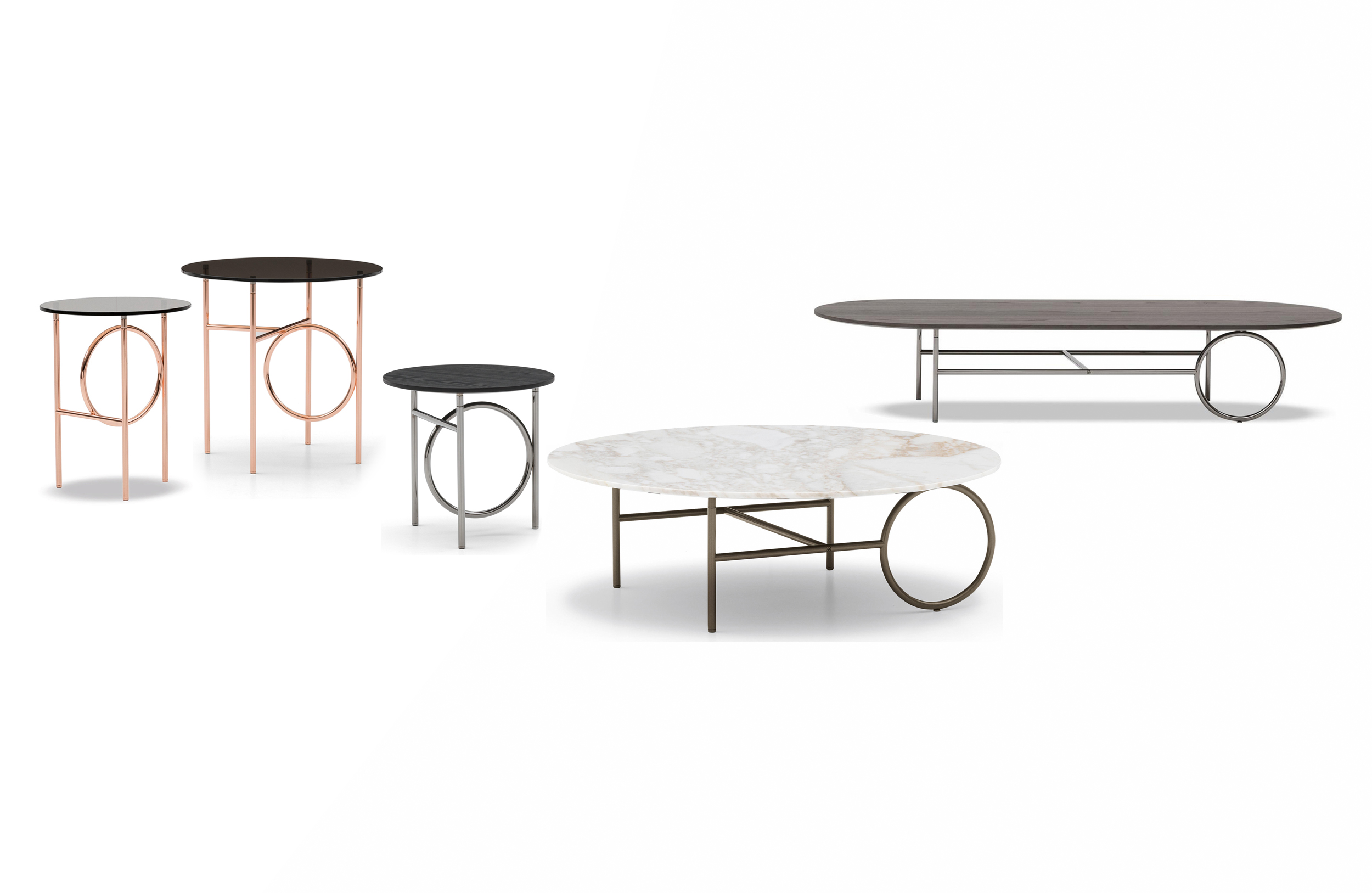 这种金属框架,有轻青铜、铜或黑镍,有不同的高度。圆桌由椭圆形或圆形顶部完成,直径不同,可在青铜玻璃、卡拉卡塔大理石或甘草刷灰中定制。