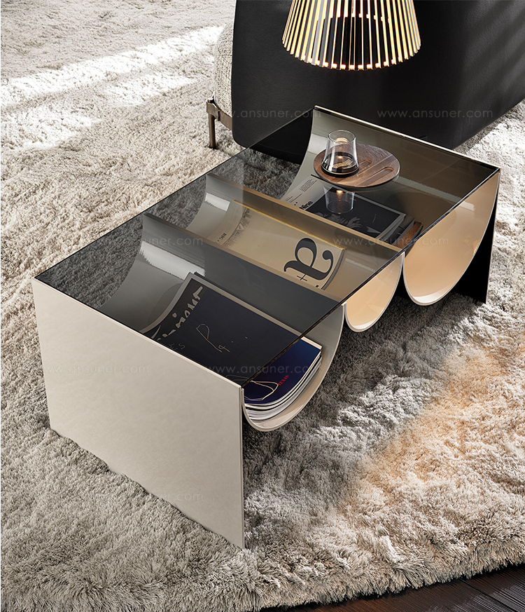 波浪咖啡桌是由一种烟熏的灰色玻璃制成的,它由一种漆成的铝结构支撑着,外面是一种沙子或浅青铜色的色调,里面有一种淡黄色的色调。