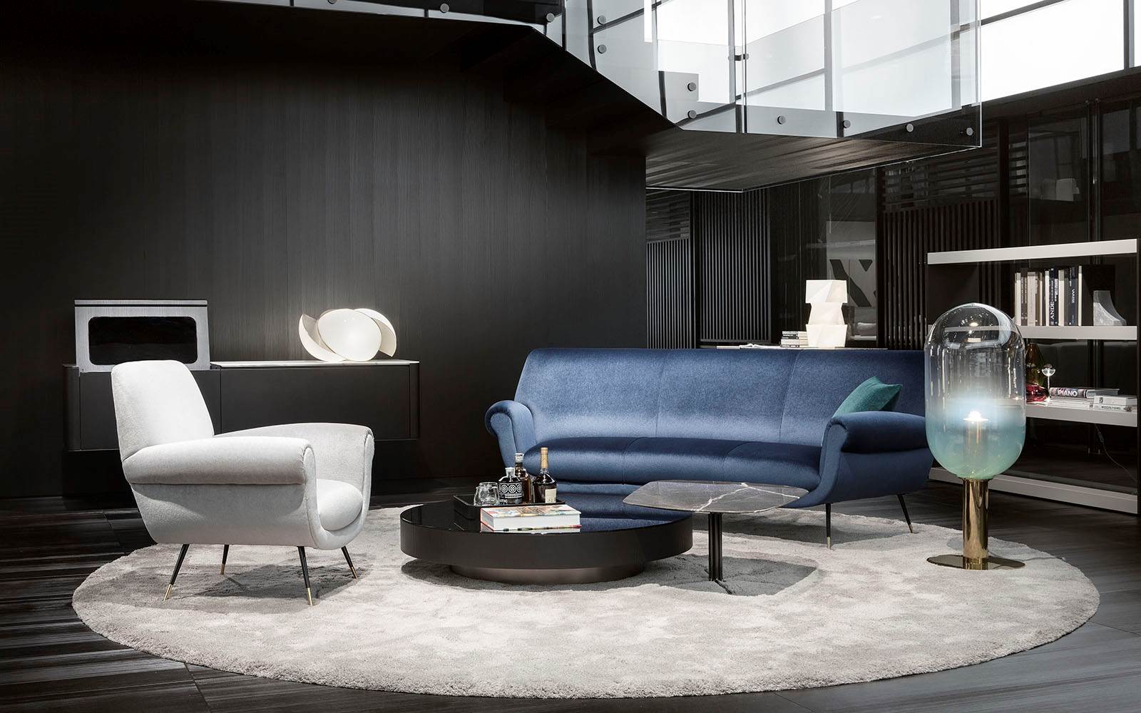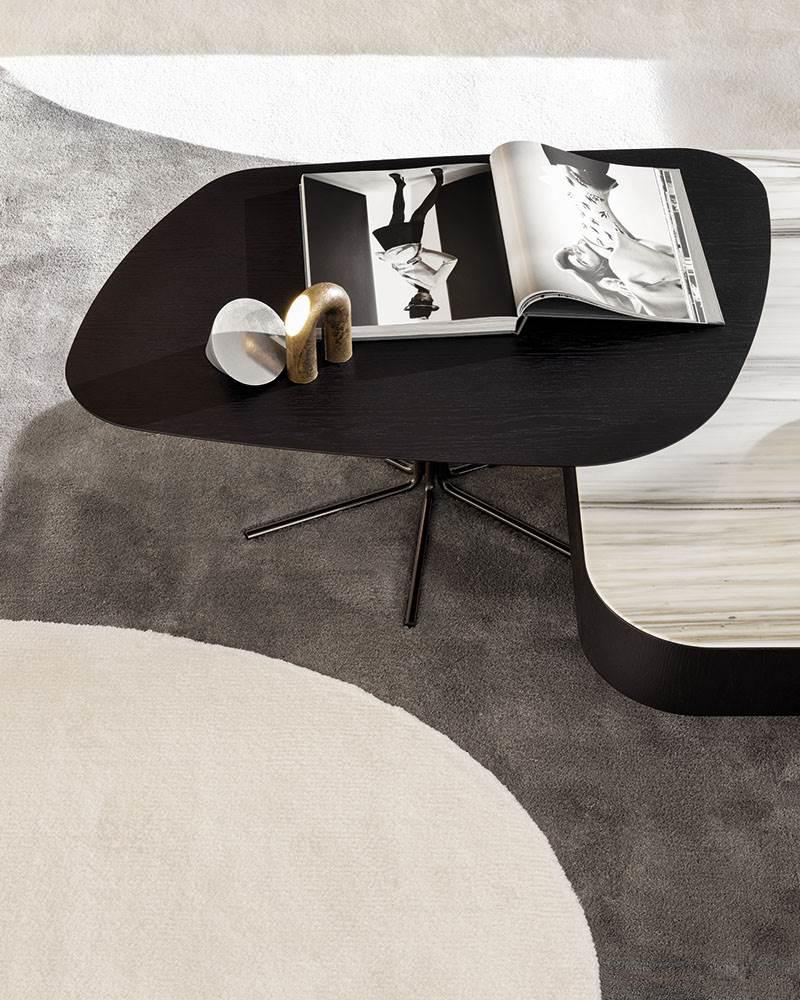 由于其纤细的结构,以及不同的高度和不同的顶部宽度,这张桌子看上去就像一根细线从地板上伸出来,沉入室内收藏的地毯的柔软纹理中。