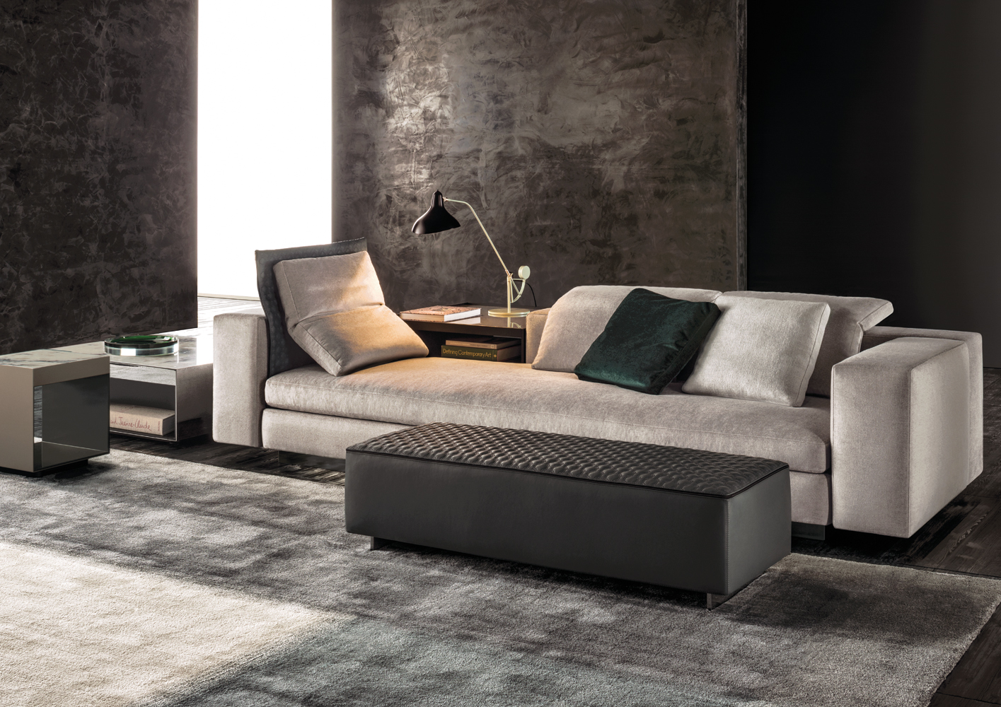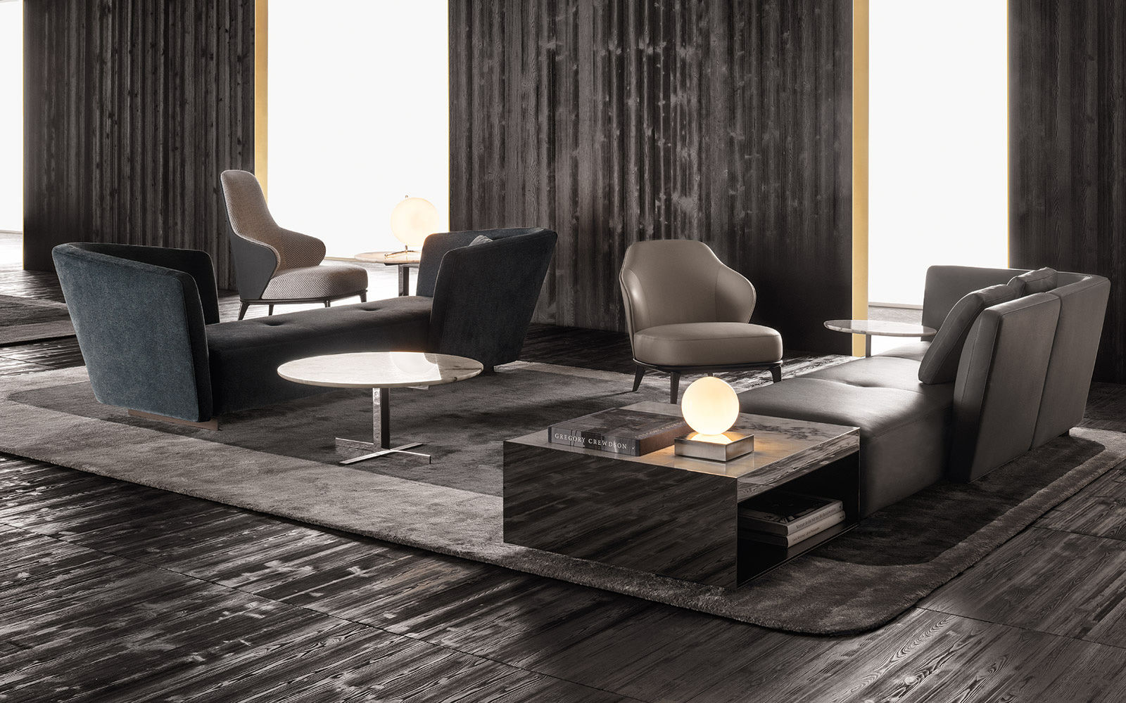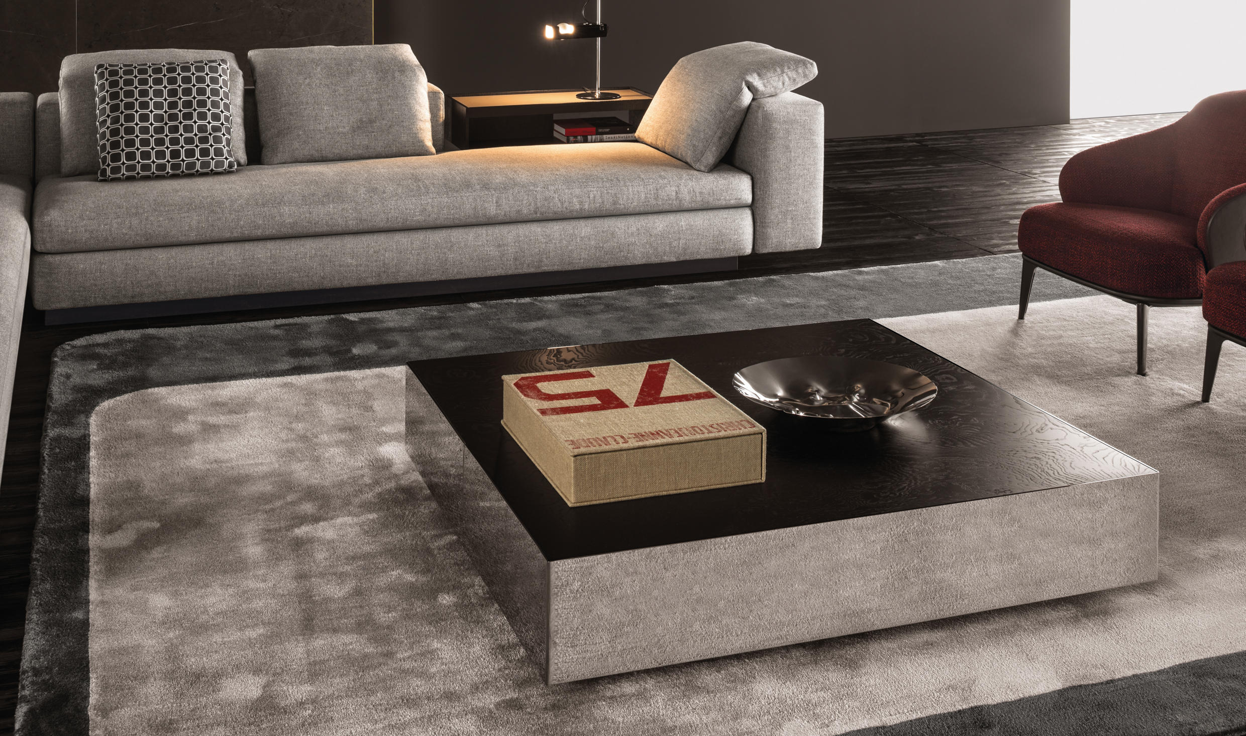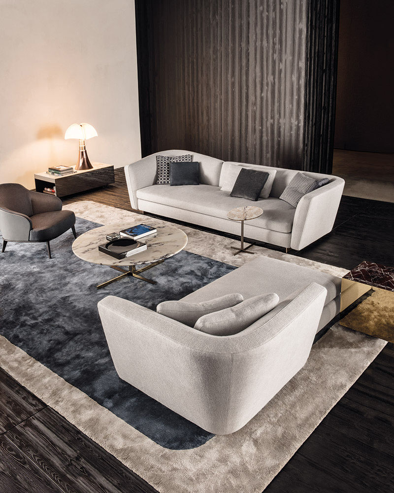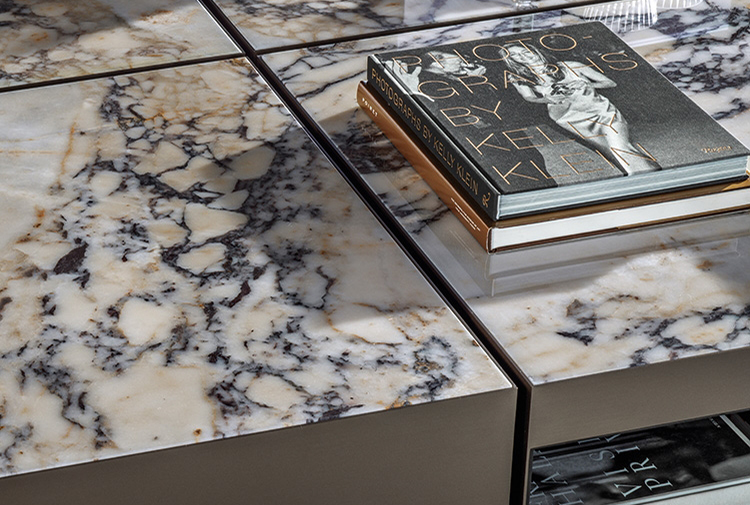 这是用于收纳贵重物品的边几系列,拥有纯粹而简洁的美学设计,有着精美绝伦的多种材质组合。这一边几家族拥有华贵的美学特质,因而也有着非同一般的功能,在提供实用置物表面的同时,呈现精美的装饰效果,具有50年代和60年代的米兰设计风格。金属构架的表面有亮铬色、亮金色和亚光铜色,嵌入构架的台面可谓画龙点睛,选用多种珍稀的大理石材质,其中包括Arabescato Purple、Sahara Noir和Rosso Levanto,或是Moka色的白蜡木、Moka色橡木。从建设性的角度来看,Elliott边几的内部储物空间可以用于摆放杂志或其他物件,有花岗石色的亮面漆或Moka色开孔橡木可供选择。金属材质的外部框架搭配包覆木质的内部框架,以此可以看出工艺的复杂性,同时平添一份温暖的质感,展现Elliott边几的名贵特质。