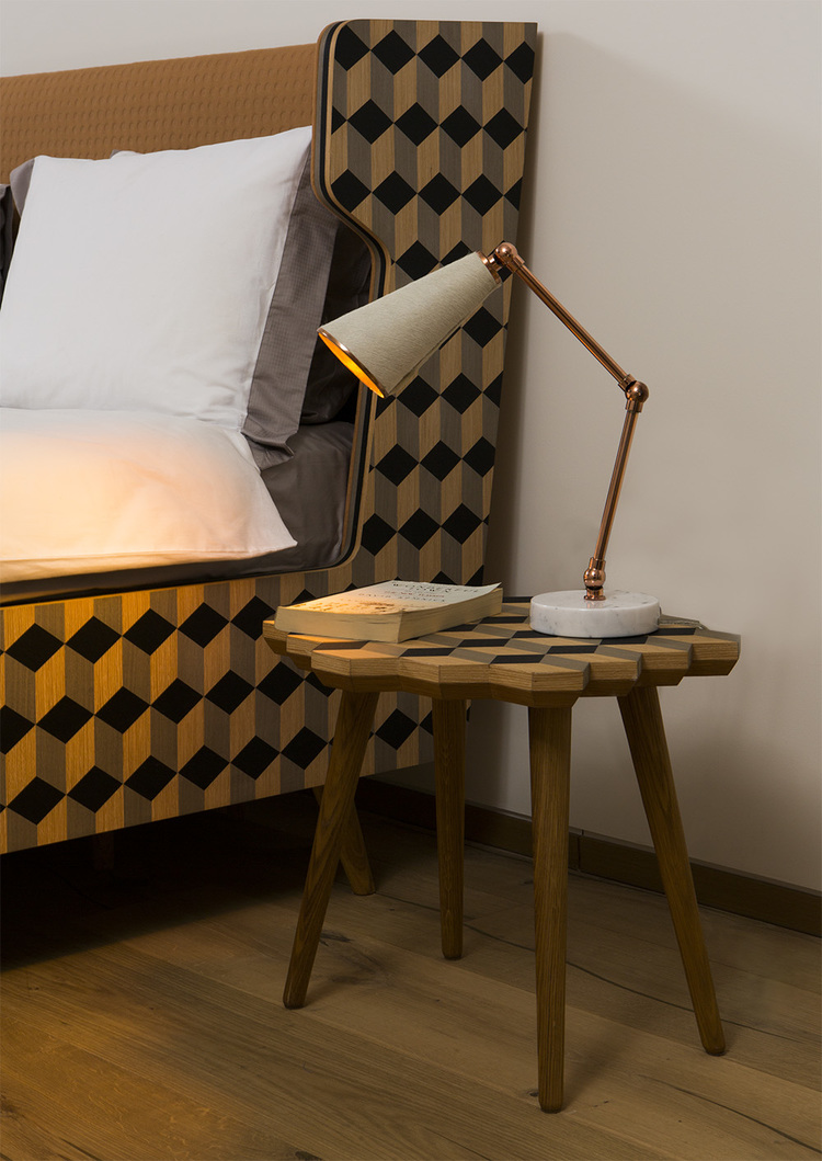 Dip Bed是Dip Collection的新添加产品。使用与凳子相同的材料制作的;美国白橡木和三种不同颜色的木材单板和深橙色的Kvadrat室内装潢组合在床头板上使用。床的边缘上的3个彩色的线性细节被设计来完成侧面的图案。这件作品是由伊斯坦布尔有才华的工匠手工制作的,它的独特的美学外观让人感觉舒适。