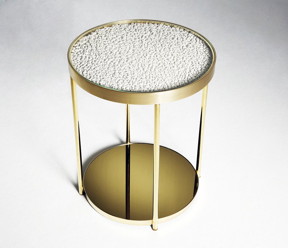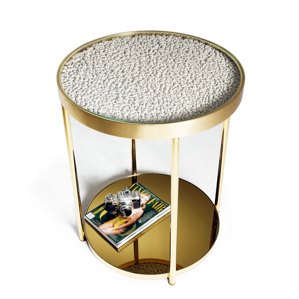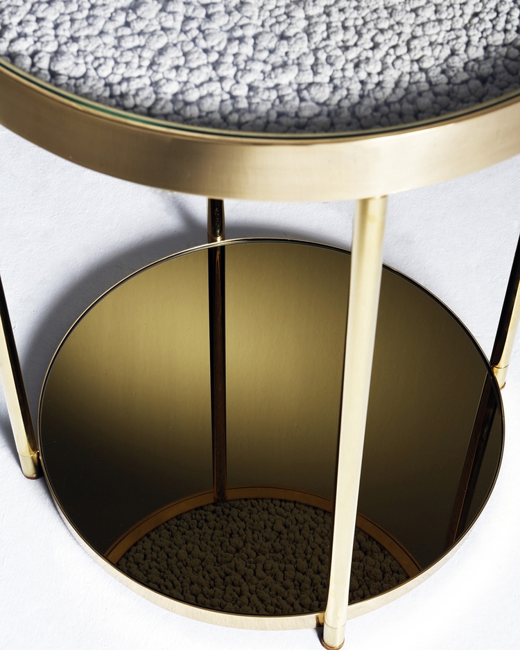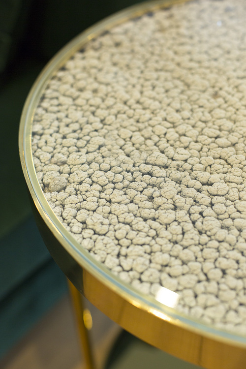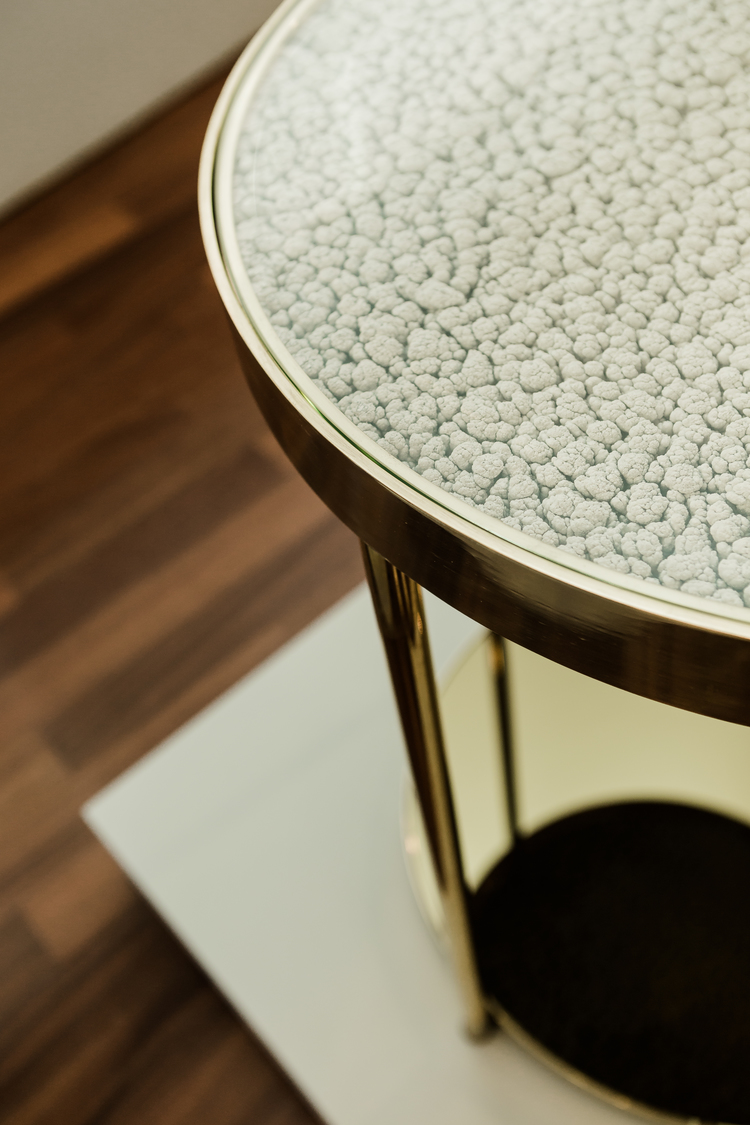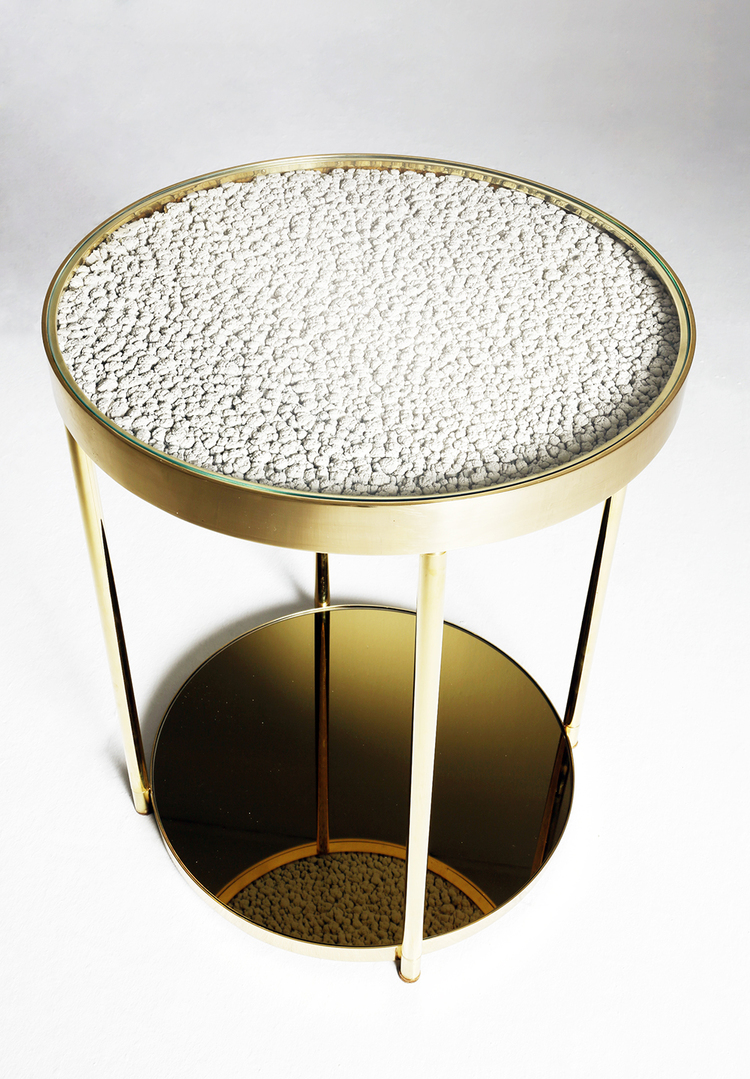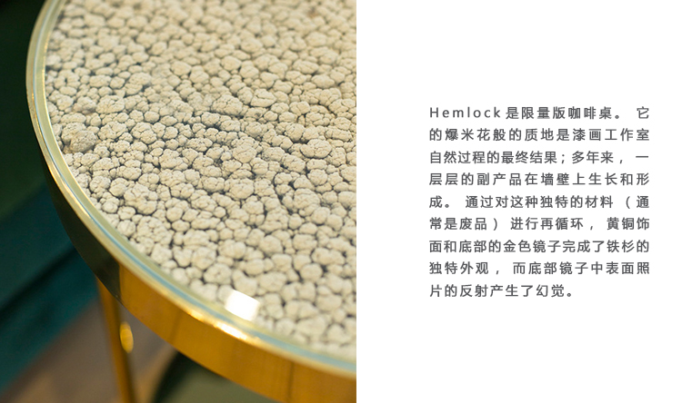 Hemlock是限量版咖啡桌。 它的爆米花般的质地是漆画工作室自然过程的最终结果; 多年来,一层层的副产品在墙壁上生长和形成。 通过对这种独特的材料(通常是废品)进行再循环,Hemlock已经被创建。 黄铜饰面和底部的金色镜子完成了铁杉的独特外观,而底部镜子中表面照片的反射产生了幻觉。